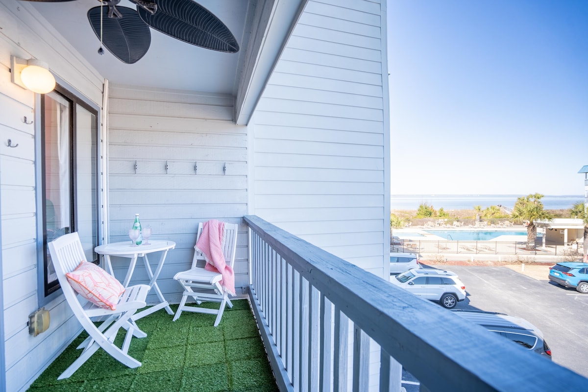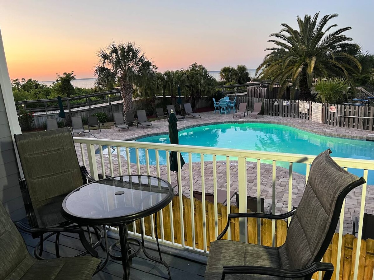 PRIVATE BEACH ACCESS from this 1110 sq ft 2 bed / 2 bath OCEANFRONT condo located on Tybee's north end. Community POOL and TENNIS! 1st floor condo overlooks the pool; ocean view where the Savannah River meets the Atlantic Ocean in the distance. Blocks from Huc-a-poo's and walkable to the Lighthouse. Caribbean vibe decor. Private balcony and seating. King size primary with Tempur-Pedic mattress. Purple queen size mattress in guest bedroom. Sleeper sofa. W/D in unit. Beach chairs available.