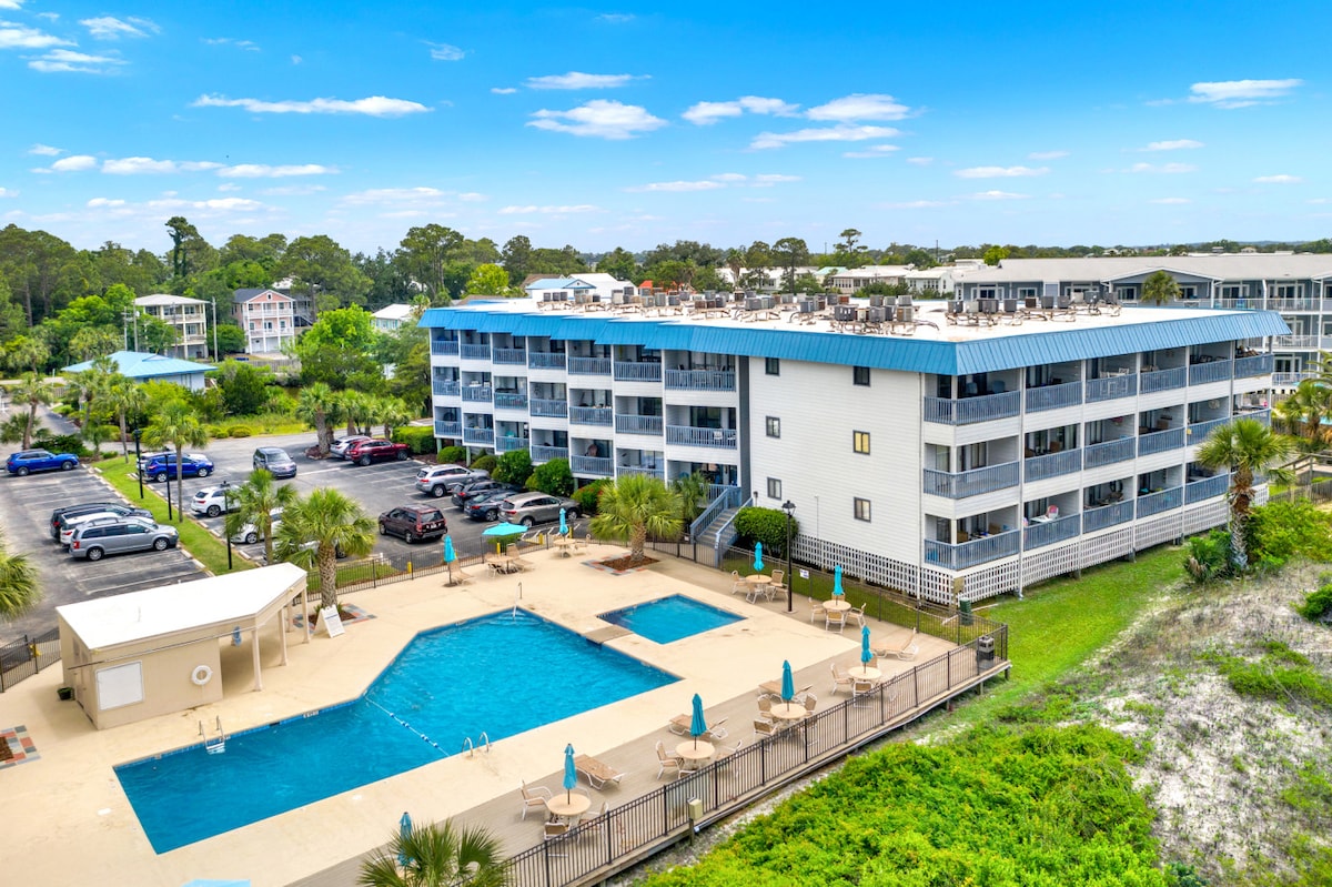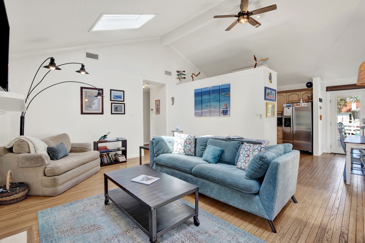 Romantically relax with your special someone just steps away from the beach in the Love Bird’s Nest. This inviting A-frame style, third floor unit is a perfect and private cozy getaway with just enough room for two. You can easily stroll to convenient shops, bars and restaurants and enjoy peaceful mornings to the sound of the ocean from the front or back porch balcony. Please be aware of the A frame design, the ceilings can be low in spots. 1 parking space.