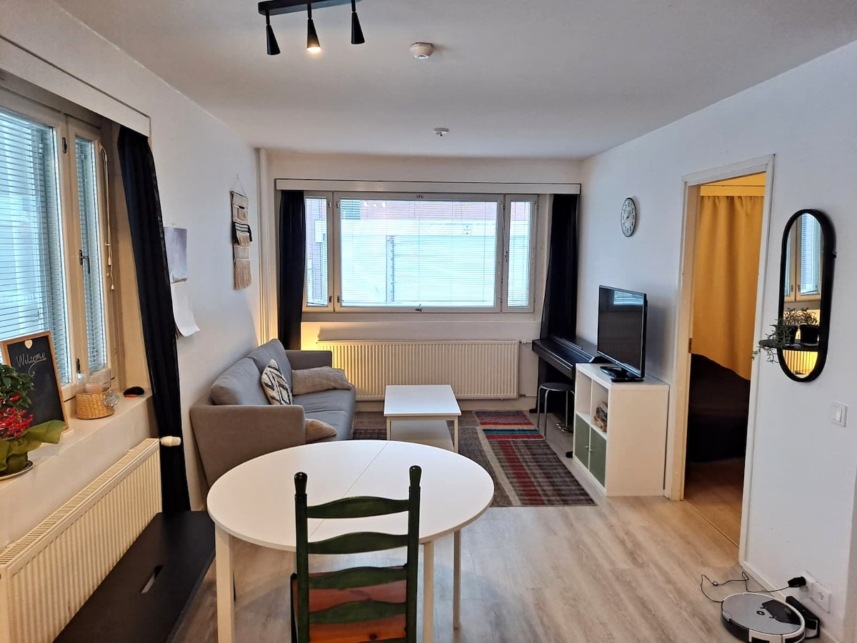 The beautifully renovated one bedroom apartment will serve you during your stay. The apartment has a sauna and a washing machine. The kitchen has just been renovated and is equipped with with modern equipment. The bedroom has twin beds and the living room has a double sofa bed. If necessary, a bed for a baby is also provided. The apartment has a beautiful décor and large windows to the evening sun. Welcome!