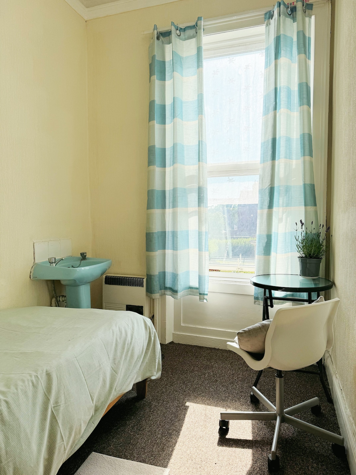 Cosy double room with lockable door. The room has built in wardrobe with plenty of storage, double bed, linen/bedding (and spares), small desk and desk chair. Room facilities include towels, hair dryer with attachments, small ironing board, iron and extension lead. Anything else you might need during your stay is likely to be in the communal areas. Please feel free to ask if you need anything and we will do our best to accommodate.