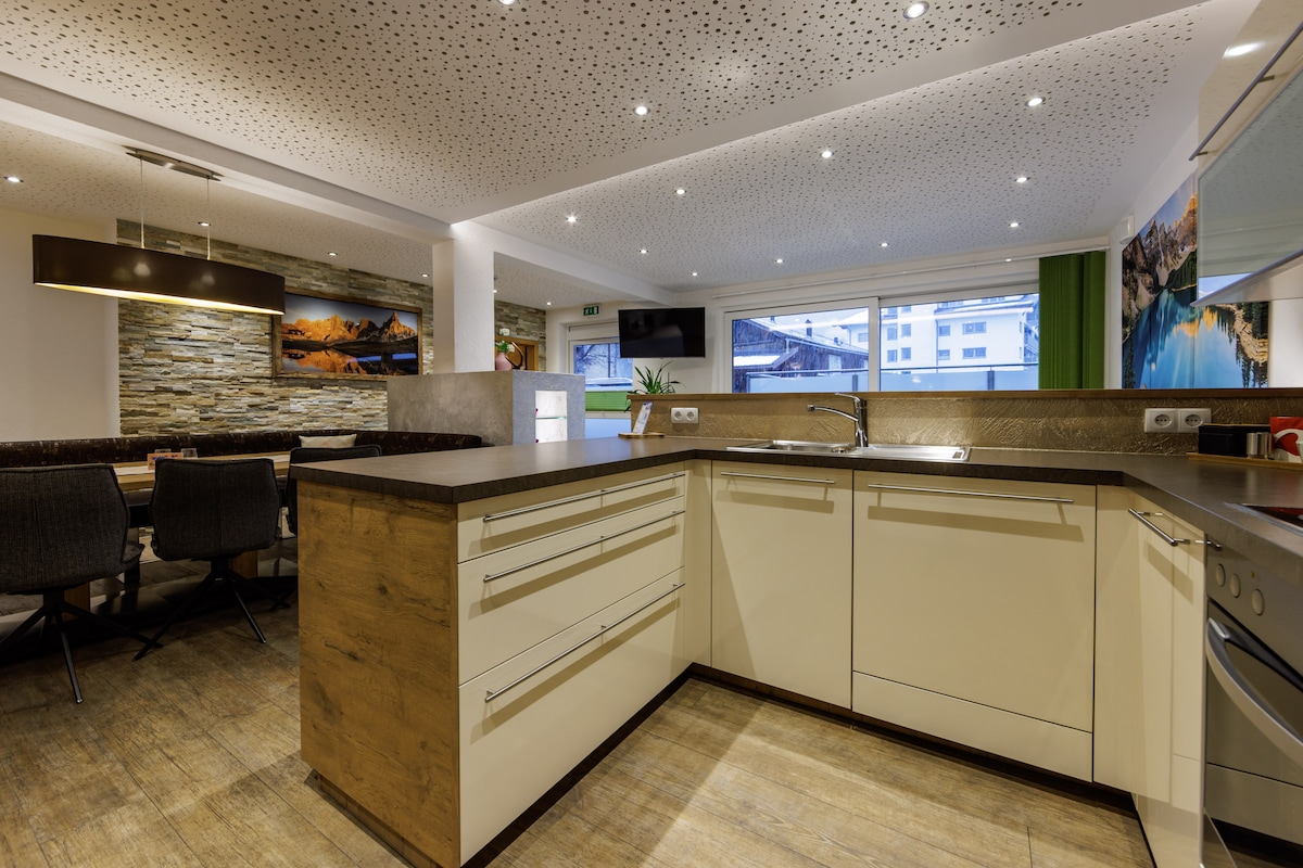 Modern 4-bedroom penthouse apartment on 2 levels with outdoor sauna and roof terrace with view to the mountains. Best location: 80m next to the main cable car station 3S-Penkenbahn. Restaurants, supermarket and bars in the surrounding area. FREE access to the adventure pool and tennis courts (outdoor), just 250m away. Large garden for relaxing, playing (kids go-kart track) and barbecuing. Fast fiber optic WiFi included. Enjoy a "Welcome Schnaps" from our private fruit distillery!
