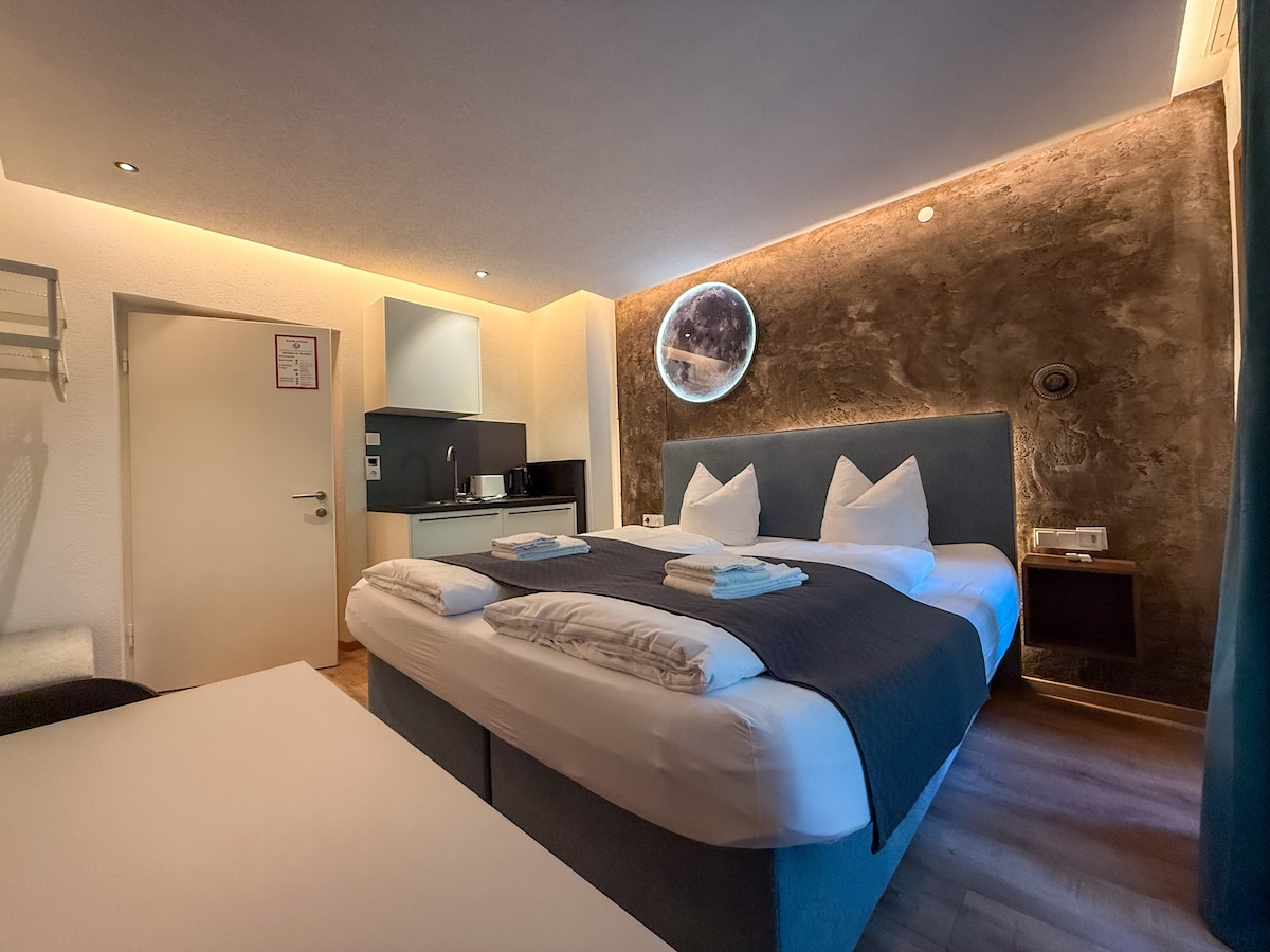 Willkommen im stilvollen Einzelzimmer der Luna Studios – perfekt für Solo-Reisende, die Design, Komfort und zentrale Lage schätzen. Genieße die ruhige Atmosphäre, eine smarte Raumaufteilung und eine praktische Mini-Küche für deinen Aufenthalt. Ob Business oder Freizeit: Von hier aus erreichst du Cafés, Shops und Sehenswürdigkeiten bequem zu Fuß. Dein urbaner Rückzugsort mitten in des Dorfes – modern, gemütlich und bestens ausgestattet.