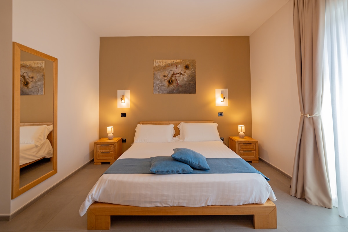 Fossili, minerali, vegetazione… natura e arte sono i temi che caratterizzano l’arredo di questa villa pronta ad accogliere ospiti disposti a condividere spazi comuni o gruppi che vogliano riservare tutte le stanze della struttura. 4 camere matrimoniali da 20 mq con letto matrimoniale, divano letto, bagno, frigobar, TV. Giardino, veranda con salotto lounge e terrazza con solarium con vista sul mare e sulla riserva naturalistica di S. Tecla.