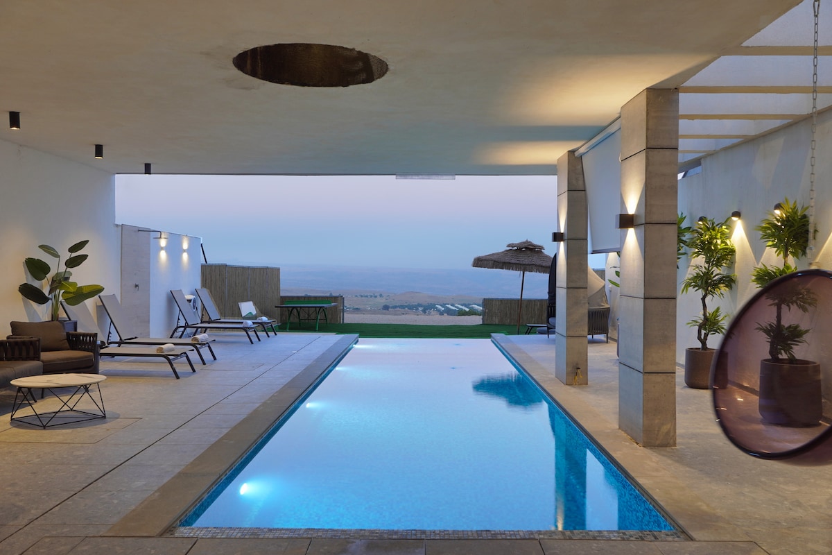Villa Circle features 8 spacious bedrooms with modern luxury design, a fully equipped kitchen, a bright living room, and a large yard with a heated covered pool. Next to the pool you’ll find a large outdoor spa jacuzzi, wet & dry saunas, and shaded seating areas. Perfect for couples, families, and groups of up to 31 guests.