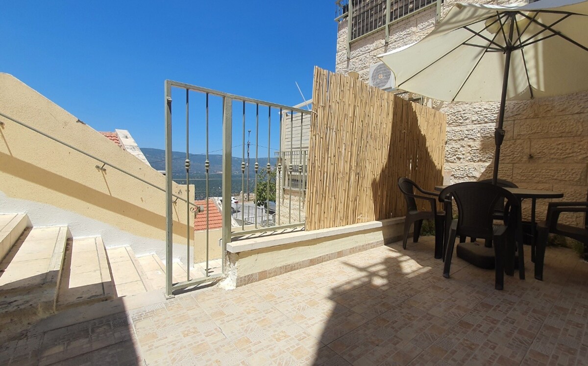 3 bedrooms (4 rooms), 2 bathrooms, balcony Fits comfortable 7 people plus extra pullout bed and a pack and play Walking distance to the Old City, Artists' Quarter, Synagogues, the Arizal's Mikvah, shops, restaurants, and supermarkets High-speed Wi-Fi One of the rooms is the Shelter Fully kosher kitchen Central air conditioning unit Large hot water urn, large electric hot plate Beautiful view of the Holy City of Tzfat, Meron and the Galilee mountains up to Tiberias One parking space