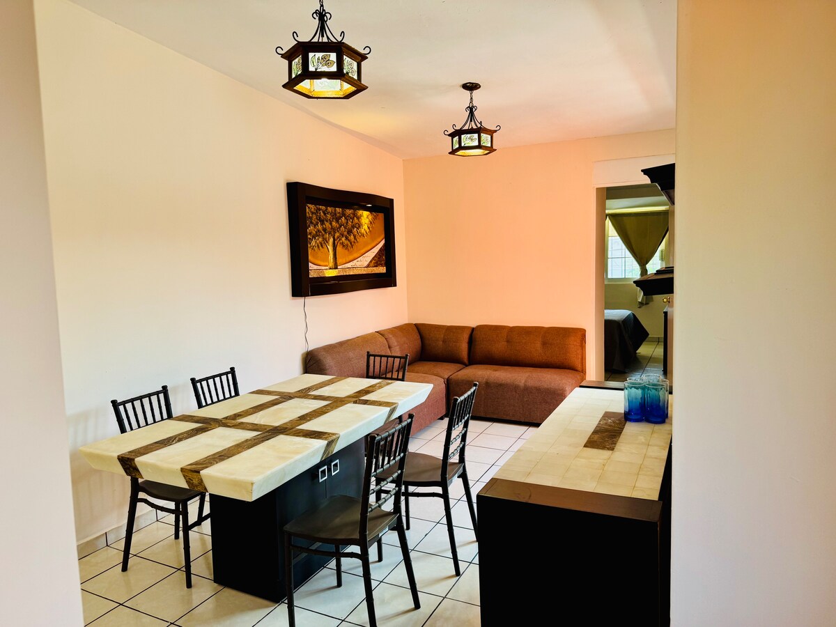 La mejor zona de la ciudad, excelente ubicación. Lugares cercanos: Restaurantes, centros comerciales, Gym y zona bancaria, además de estar a tan solo 10 minutos del centro histórico 2 habitaciones (King/Queen) cada una con baño completo, sofá cama con colchón individual en sala Cocina equipada, sala comedor y acogedora terraza 2 Cajones de auto pequeño en linea Wifi/Netflix/HBO/Star+