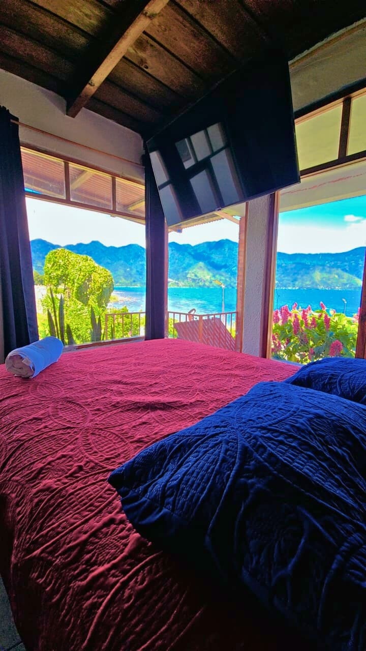Beautiful built boutique cottage with large bay windows and breath giving views of Lake Atitlan´s majestic volcanoes. This solar powered cottage has it own kitchenette, wardrobe and top quality mattresses and linen. MOST RELIABLE INTERNET ON THE LAKE —- Starlink system / solar! This unique mountain retreat oasis is perched up on a peaceful hill away from town noises and with pure spring water. Yoga classes, saunas and ceremonies are available upon request. The perfect place to unwind 🙏