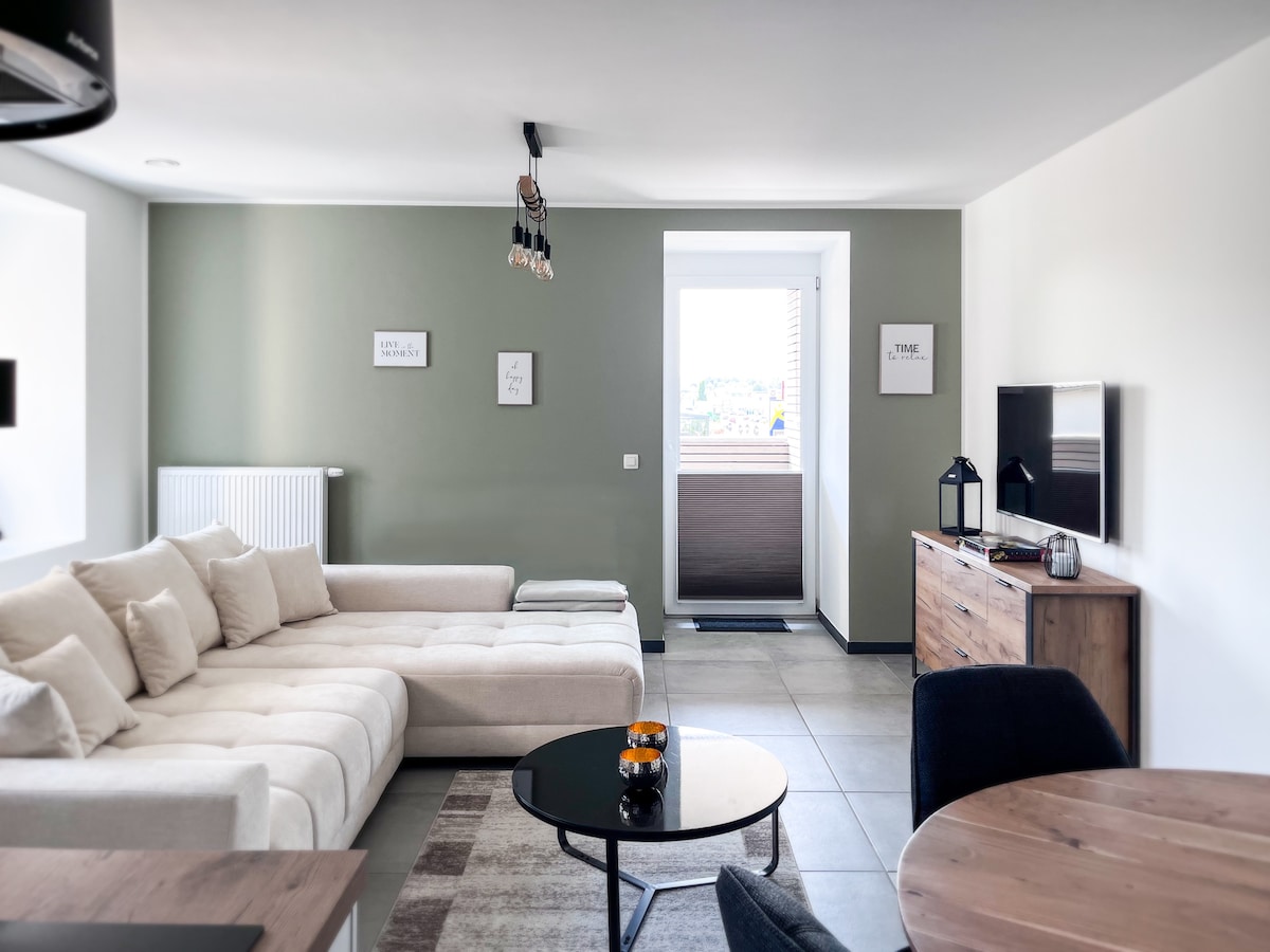 Entspannt euch in unserer besonderen und ruhigen Unterkunft! Das neu eingerichtete Apartment für bis zu 4 Personen mit ca. 60 qm verteilt sich auf zwei Etagen. Hervorzuheben sind eine vollausgestattete Küche, TV, Schlafcouch, große Panoramafenster, ein gemütliches Boxspring-Bett, die eigene Terrasse mit Außenbestuhlung sowie ausreichend Kundenparkplätze. Das Panoramafenster der Ferienunterkunft ist Richtung Sonnenaufgang und Wald ausgerichtet. Wir freuen uns auf euren Besuch!