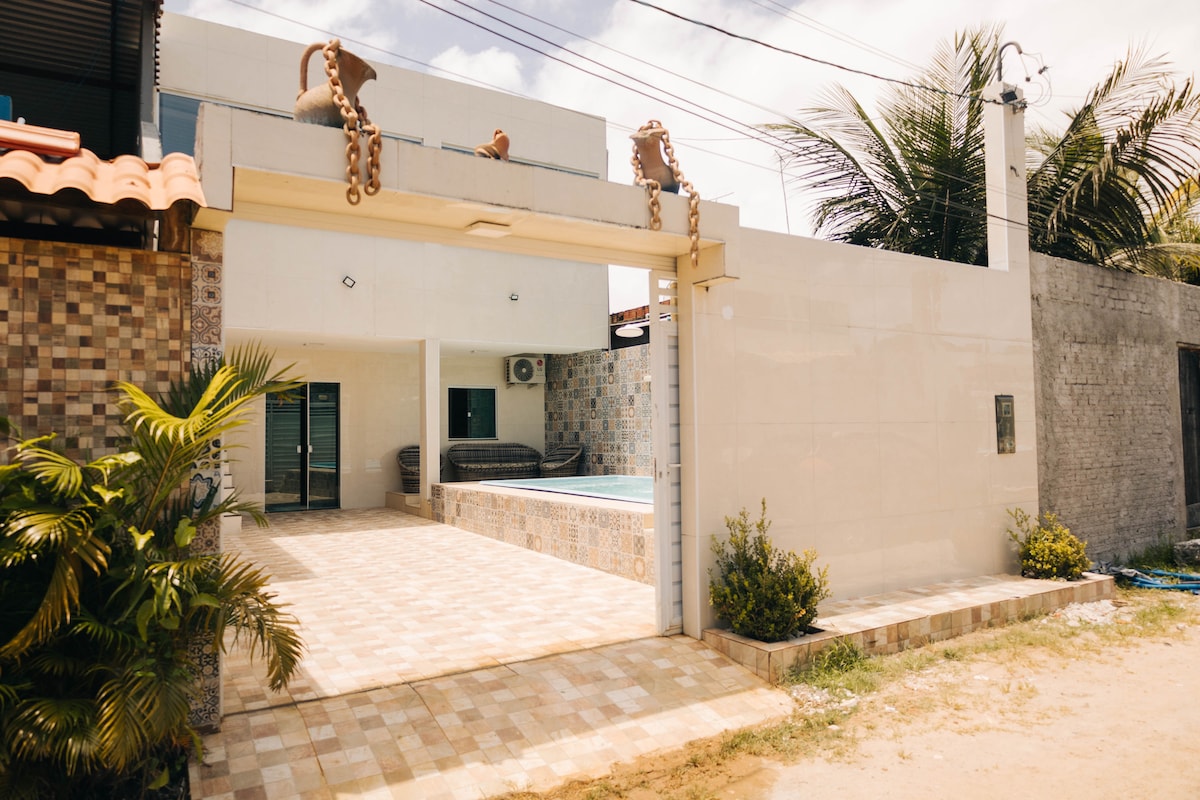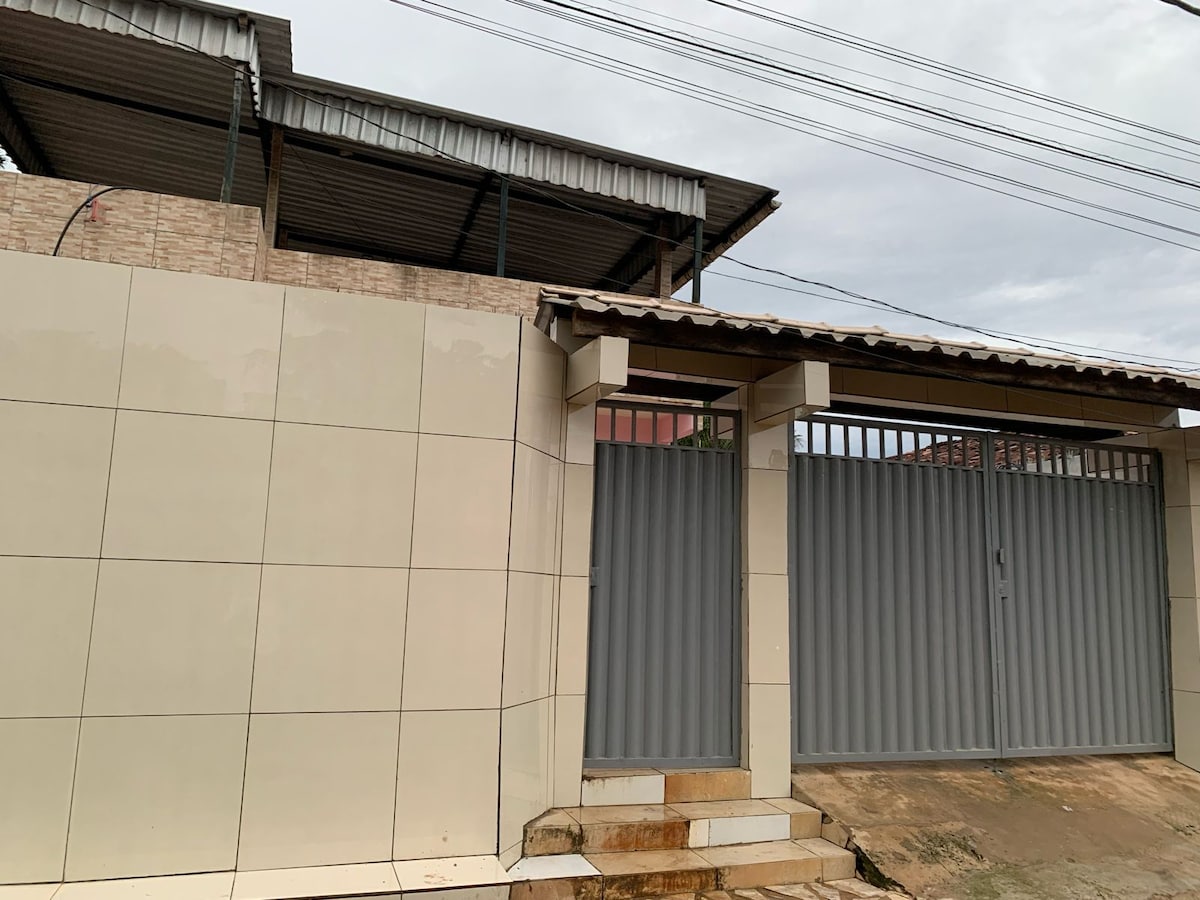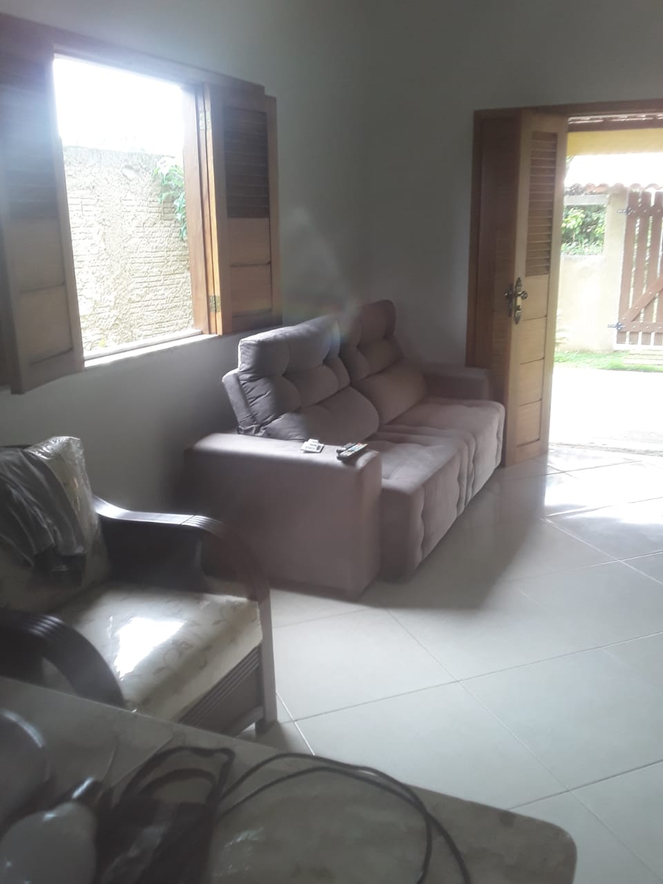 São 03 quartos: o principal, com cama de casal, possui suíte particular. O segundo quarto, com duas camas de solteiro, possui suíte reversível. O terceiro quarto possui uma cama de casal e uma de solteiro. Todos os quartos possuem ventilador. O ambiente comum é composto por sala com TV, ar condicionado e ventilador, copa com mesa e cadeiras e cozinha com fogão, geladeira, armários, com panelas e utensílios do dia a dia. Área de serviço externa com tanque. A casa não é forrada.