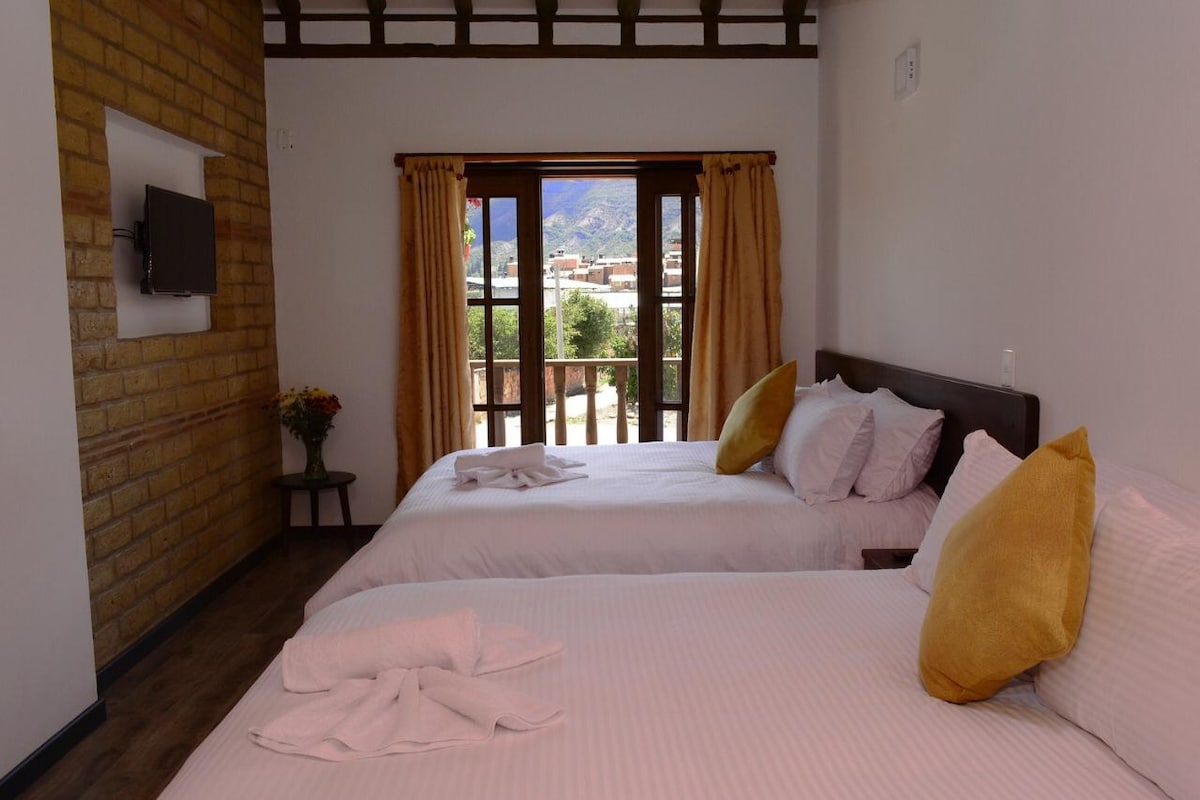 Esta linda habitación se encuentra en Casa Pancha Mama con una excelente ubicación a solo dos cuadras de la plaza principal. Es Ideal para que una pareja pase unos dias romanticos explorando la encantadora Villa de Leyva. Es amplia y acogedora aequipada con una cama doble y un banio completo . La habitacion tiene una hermosa vista al patio de la casa y a las montañas. Un delicioso desayuno esta incuido en el precio de la habitación.