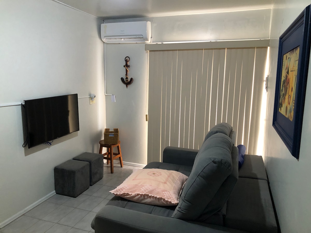 Aconchegante e bem equipado, o apto conta com ar-condicionado na sala e no quarto, além de churrasqueira. Ideal para famílias e casais que buscam descanso, diversão e comodidade. Fica a apenas meia quadra da Prainha e a 10 min a pé das praias da Enseada e Praia Grande, com fácil acesso às atrações da região. Próximo a restaurantes, bares, pizzaria, mercados, padarias e serviços essenciais. Não possui garagem, mas é possível estacionar na rua em frente ao prédio, que é tranquila.