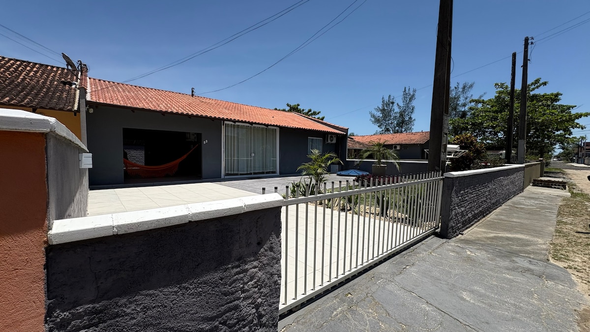 Casa aconchegante para ter bons momentos com sua família e/ou amigos. Com piscina, área gourmet com churrasqueira, forno e fogão a lenha, 01 lavabo, 01 suíte com ar condicionado, 03 quartos, sendo 02 com ar condicionado, 01 banheiro, cozinha, sala de estar com TV, quintal grande com garagem e área de serviço. Terreno todo murado, rua calçada, á 800 metros da praia e dos comércios. Acomodações para até 10 pessoas.