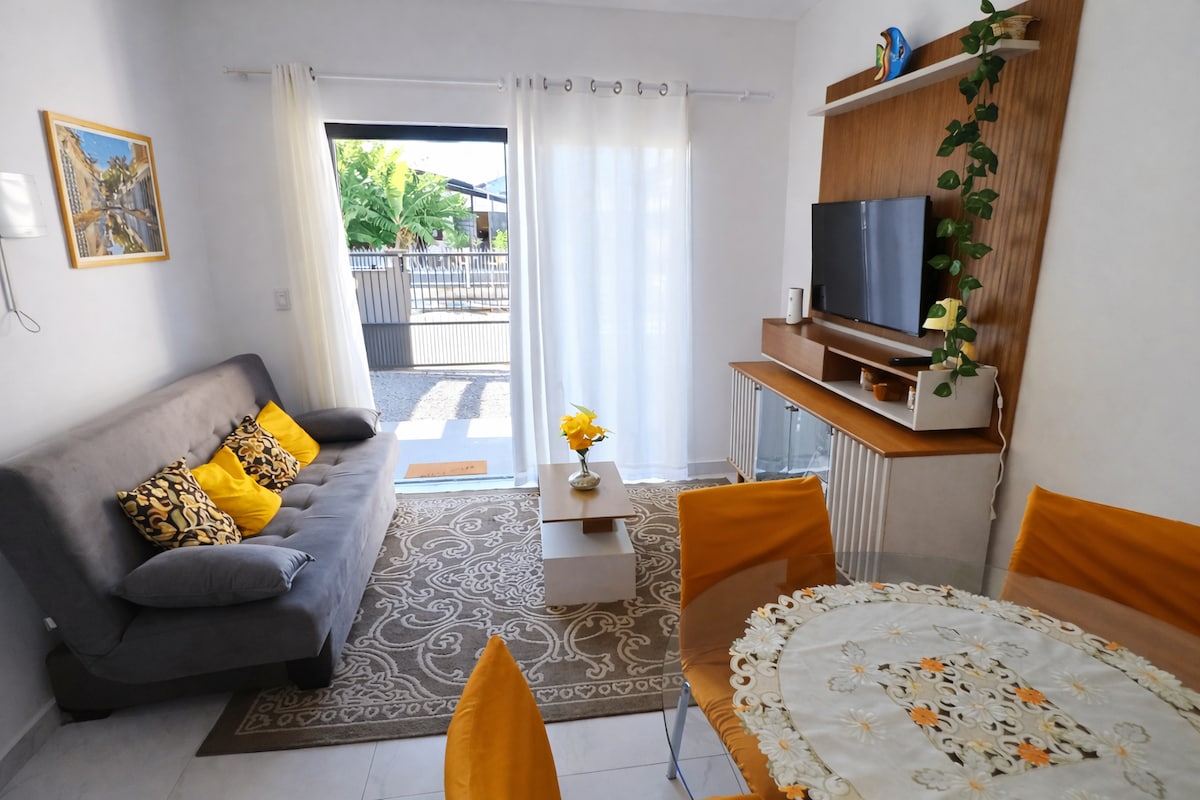 Casa com piscina,dois quartos confortáveis com camas novas,ar condicionado,sendo um deles Suíte. Nesse espaço super novo e aconchegante você encontrará tudo que precisa para tirar suas férias e aquele descanso merecido. No centro da praia de Ubatuba, 350 metros do mar com toda comodidade de supermercado próximo,restaurantes,posto de combustível e lojas. Relaxe neste lugar único e tranquilo. ambiente perfeito