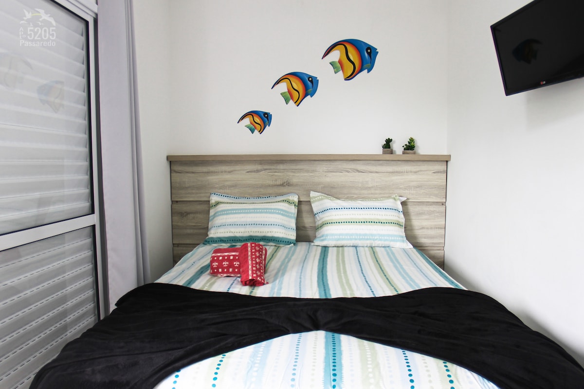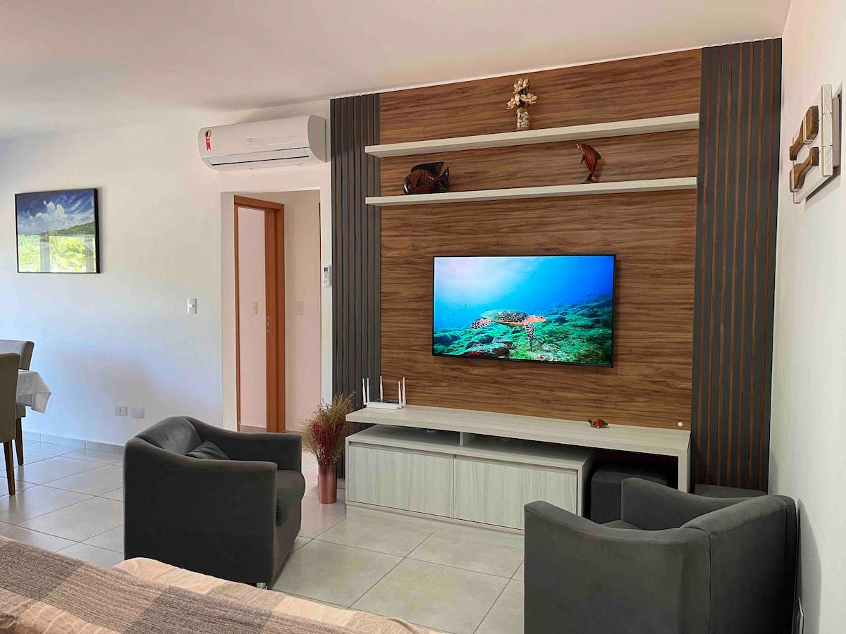 Destaques da acomodação: - 400 mt da Praia, - 2º andar, - Acomoda 5 pessoas - 2 quartos (1 suíte), - sala, - cozinha toda equipada - filtro de água, - área gourmet com churrasqueira, - lavanderia, - ar condicionado nos quartos e sala, - condomínio com piscina, - 1 vaga garagem coberta - Pilotis. - elevador - TV 40 a 50" com canais via Smart TV - Wi-Fi, - Chave em cofre - apto virado para nascer do sol e ótima ventilação. - Proximidade: padarias, supermercados, farmácias, etc..