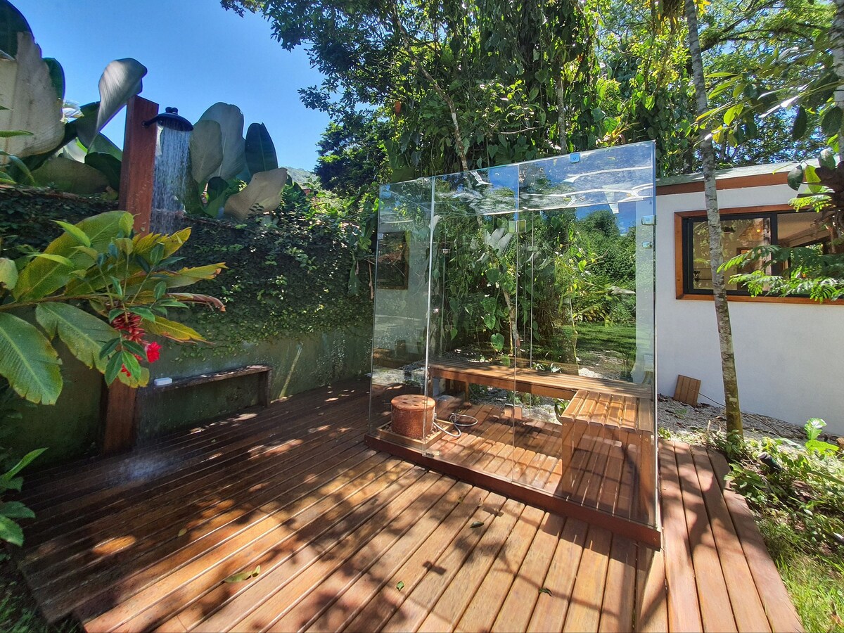Esta casa encanta os casais que buscam relaxar em Itamambuca. É composta por dois módulos separados: uma suíte com cama de casal e ar condicionado; e um Loft com cozinha equipada, sala de jantar, sala de estar/TV, sofá cama e banheiro externo. O enorme quintal completa a beleza do lugar.