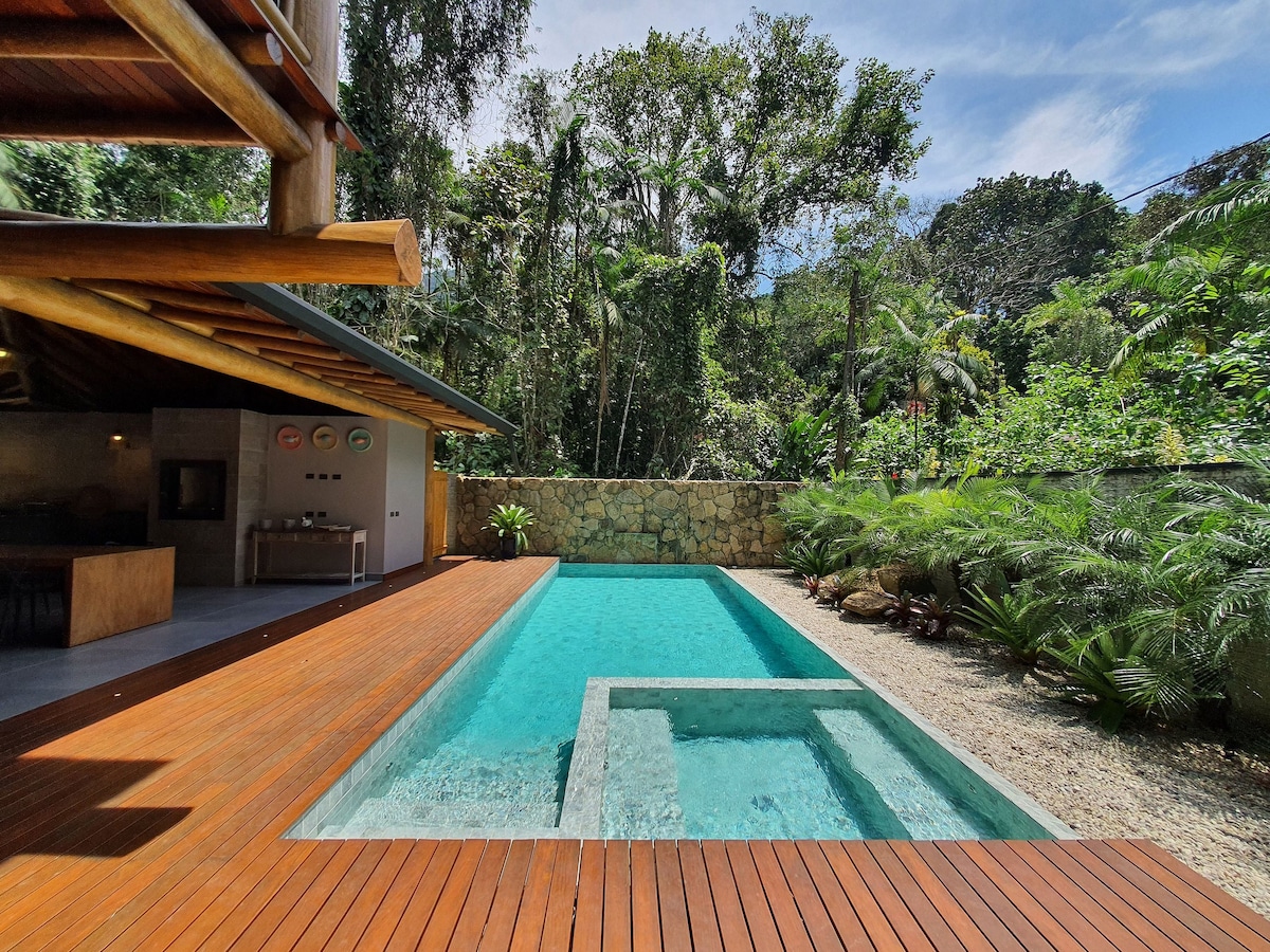 Com arquitetura típica do sudeste asiático, a casa é toda palafitada e distribui-se por dois bangalôs interligados por deck. Um verdadeiro recanto, a apenas 90m da praia de Itamambuca. Possui piscina com hidromassagem, rodeada por espreguiçadeiras com confortáveis almofadas e paisagismo tropical, que à noite ganha destaque devido à iluminação. Agradável espaço gourmet com churrasqueira. 4 suítes com ar condicionado.