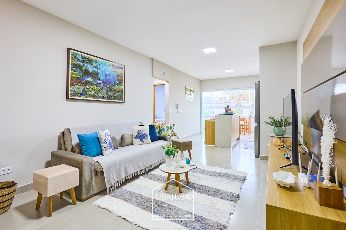 Apart. no Reserva DNA Ubatuba, localizado em frente á praia grande. Varanda com vista para o mar. Conta com duas suítes com ar condicionado e tv smart. Ar condicionado e Tv Smart de 50 polegadas na sala. Internet própria 100MB. Oferecemos também uma cervejeira Consul e um filtro de água Eletrolux. Churrasqueira gourmet super confortável e completa para a sua melhor estadia com sua família em Ubatuba. Área comum conta com piscina aquecida, sauna seca e a vapor e uma espetacular jacuzzi e cinema.