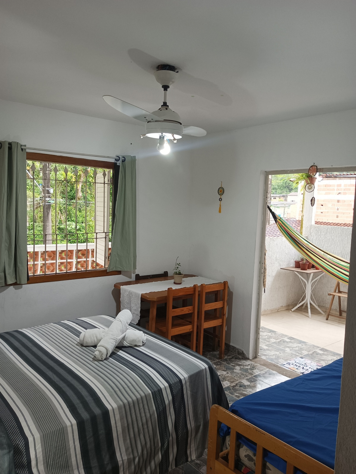 Seu aconxeguinho a 1,2 km da Praia do Perequê Açu. Ideal para casais, amigos ou pessoas viajando sozinhas! OS GATOS CIRCULAM LIVREMENTE PELO ESPAÇO 🐾😸😺 No Quarto possui 1 cama de casal, 1 cama de solteiro, Frigobar, Mesa, Ventilador de Teto, Abajur, Projetor HD, Cortina Black-out. Forneço Roupa de Cama e de Banho. Cozinha externa equipada (pensada em lanches e refeições rápidas), e Varanda com vista para as montanhas! A ENTRADA E O BANHEIRO SÃO COMPARTILHADOS COM A ANFITRIÃ.