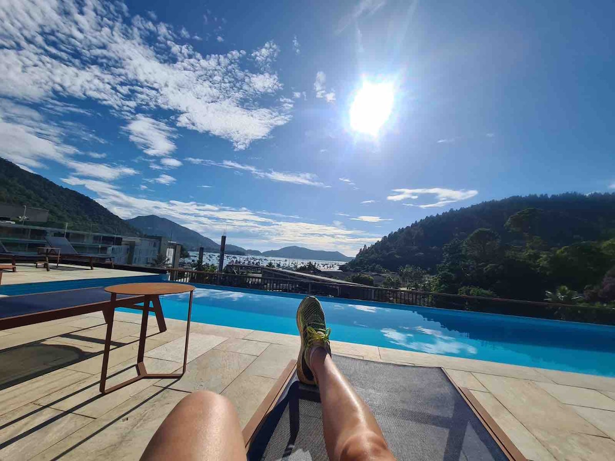 Relaxe após uma semana exaustiva neste espaço tranquilo e cheio de estilo. Por um fim de semana ou uma temporada mais longa - aqui você recarrega suas energias com vista direta para o mar. E piscina, academia se quiser mais movimento. A poucos passos das melhores Marinas do Saco da Ribeira e de praias maravilhosas. Um apartamento com todo o conforto para até 4 pessoas. O Apartamento é um Studio conceito aberto com muito charme e requinte, onde você e sua família poderão curtir momentos únicos.