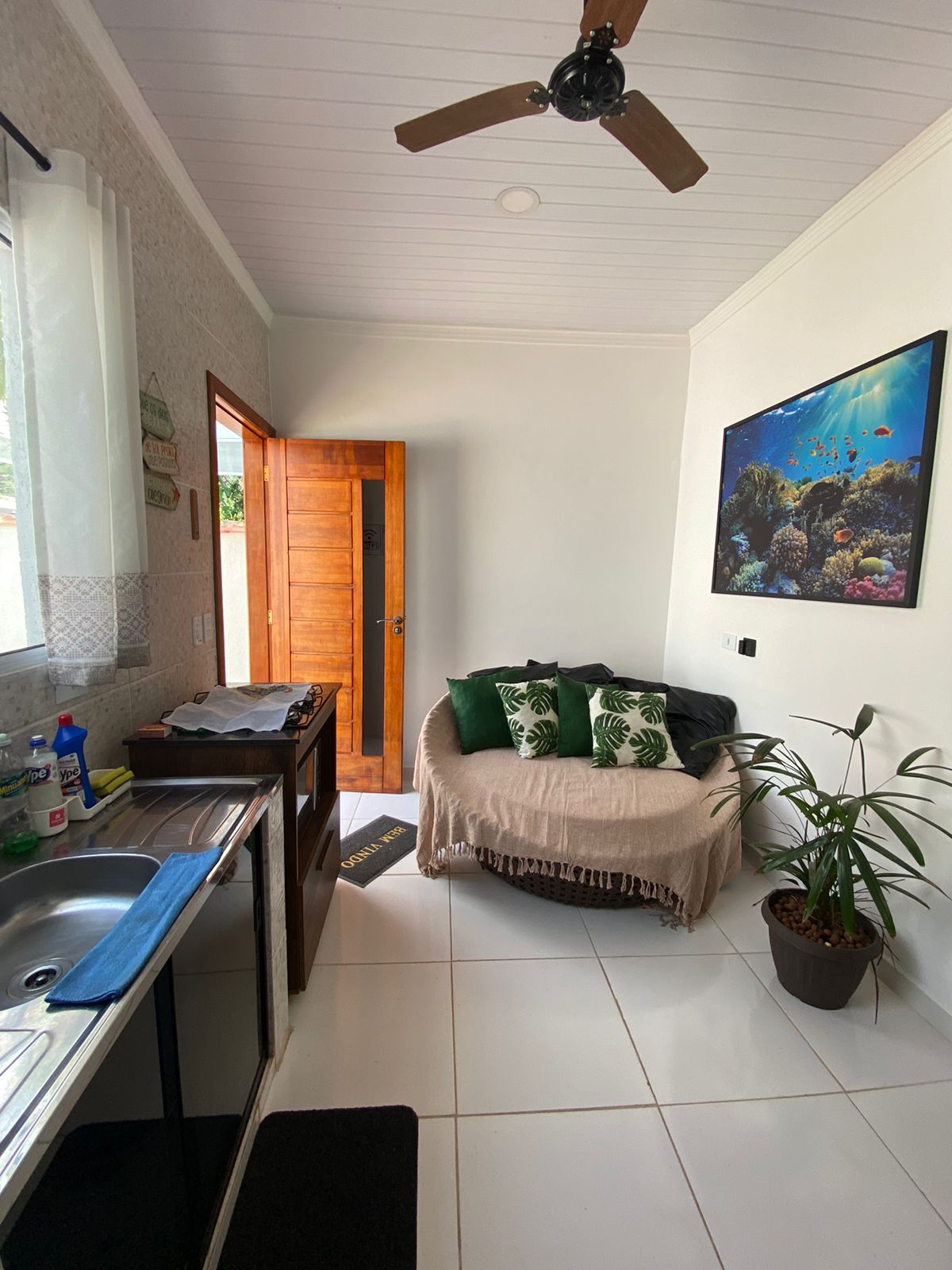 Casa edícula, com dois quartos de casal um com ar condicionado e outro com ventilador de teto, sala e cozinhas americanas com fogão , geladeira, utensílios de cozinhas, com um banheiro interno e um externo na área da churrasqueira, garagem hosped Com fácil acesso a rodovia, e a 15 minutos das praias grande, Toninhas , Tenório, próxima de supermercado, padaria, farmácia. NOSSO QUINTAL É APENAS COMPARTILHADO CONOSCO que moramos na casa da frente e garagem separada. Não deixamos toalhas e cobertas.