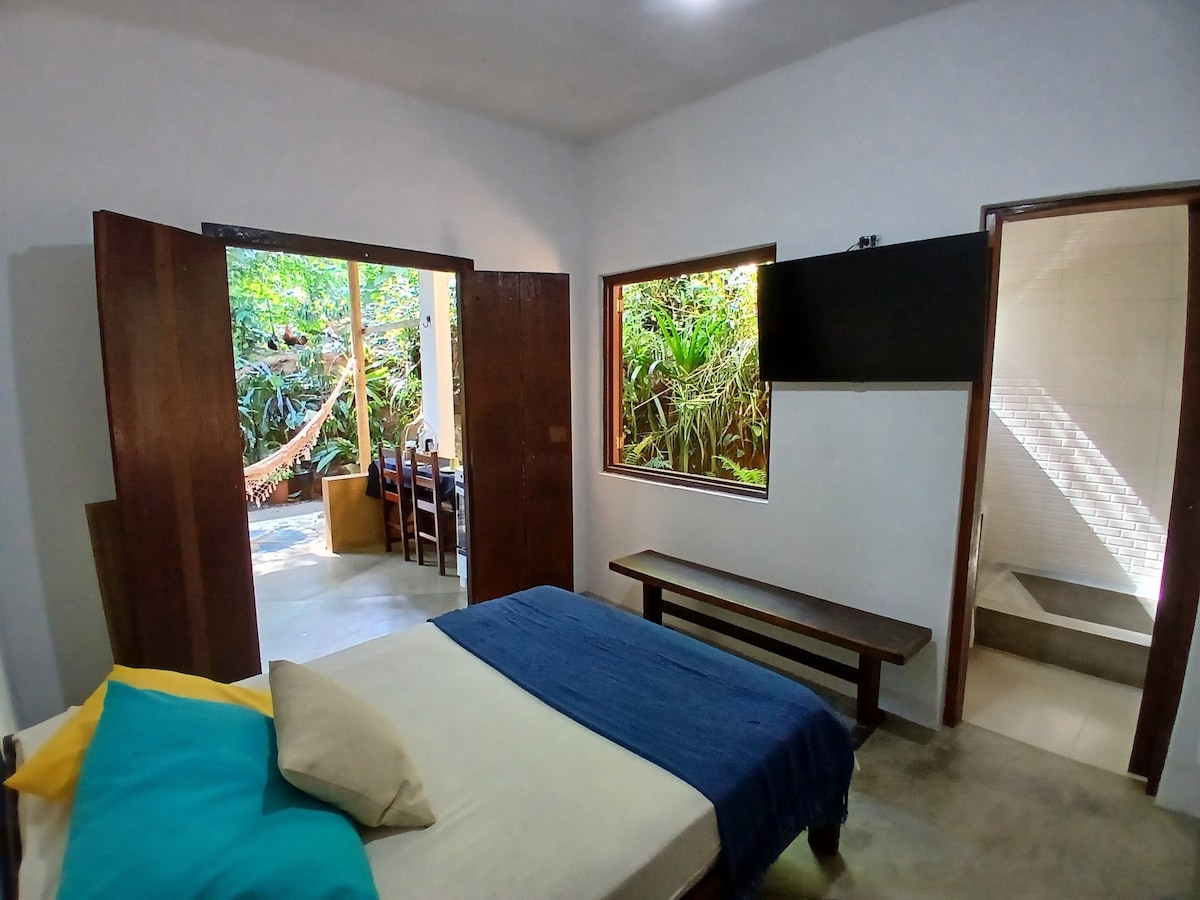 Espaço completo para 01 casal, área útil 45m2 em propriedade com outras unidades. 01 vaga carro descoberta, portão automático. Cama Queen, Ar 12000 BTU, ventilador, smart TV 50", cozinha exclusiva com microondas, frigobar, fogão 02 bocas sem forno, liquidificador, sanduicheira, cafeteira, filtro de barro. Terraço com churrasqueira, Internet claro fibra, piscina compartilhada. Praia Vermelha Praia Vermelha 100m, Tenório 400m, Cedro 1 km. Muito verde, pássaros, som do mar e ar condicionado