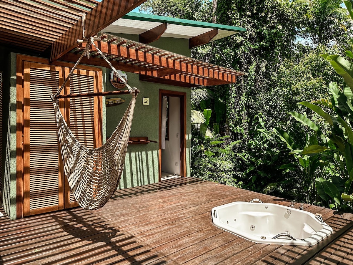 This brand new house sits high above the trees inside the Aldeia Rizoma eco village, a gated property 15 minutes away from the city historical center. The property offers a jungle gym, sauna (paid as an extra), private trails and access to 5 private waterfalls. The one bedroom studio has a king size bed built high so you can watch the forrest from it. It offers a private hot tube and a fully equipped kitchen. There is an extra bed that can be used for a third person with an extra fee per night