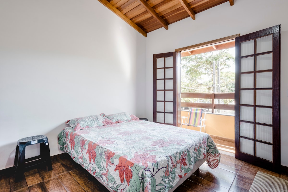 Suíte de hóspedes para 1 casal com varanda, entrada privativa, frigobar e estacionamento O espaço interno é amplo, bem arejado e iluminado, proporcionando uma atmosfera acolhedora e relaxante. Para sua comodidade, a suíte dispõe de frigobar, perfeito para guardar suas bebidas e lanches. Localizada a poucos metros da praia e do rio, a região oferece excelentes opções de lazer, como surf, caiaque e passeios ao ar livre.
