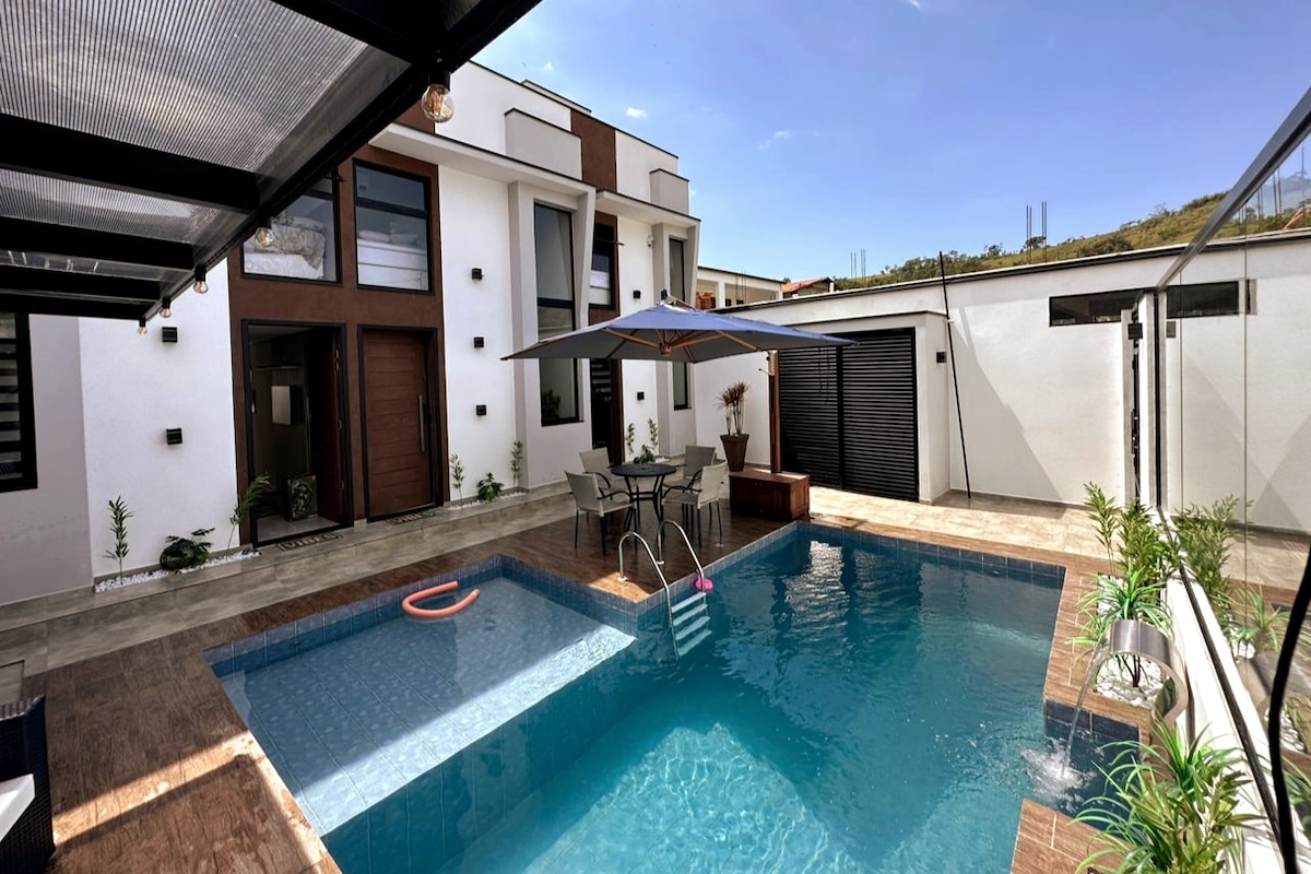 Brand new house in a quiet, paradisiacal place with total privacy, inserted in the Forest next to Parque da Bocaina in Paraty: + Panoramic view of the Valley and the Forest + 2 cozy rooms (suites) for up to 4 guests + Heated infinity pool + 100 Mbps High Speed Internet + Hot and Cold air conditioning + Private Waterfalls + Full kitchen + Gourmet Area with Barbecue and Wood Oven + 100% paved access, 10 km from downtown Paraty