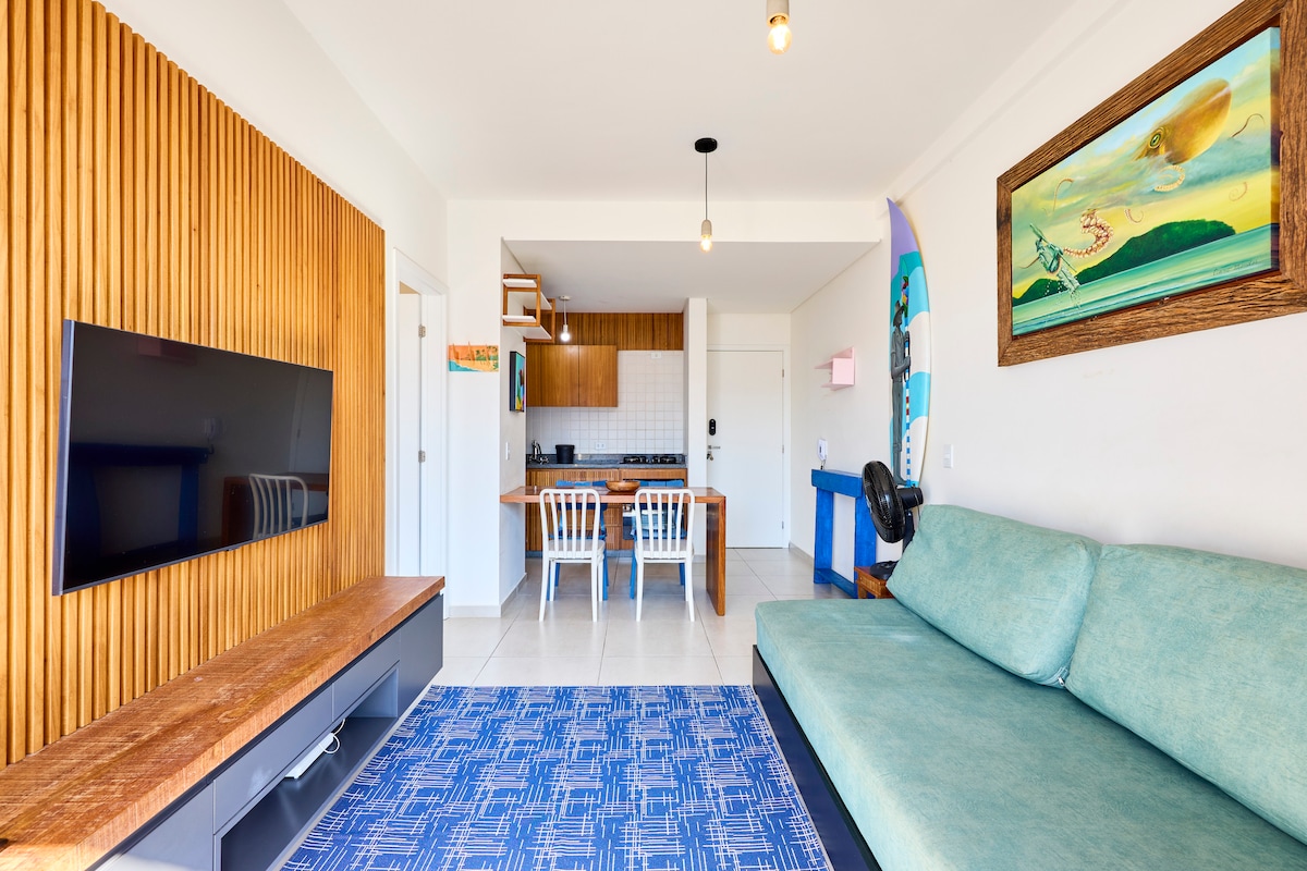 Apartamento completo no Cond. Reserva DNA Varanda c/ quintal e churrasqueira privados. Suíte e sala espaçosa c/ lavabo e a/c Roupa de cama/banho incluso, cozinha completa com utensílios, eletrodomésticos e filtro de agua. Máq de lavar e secar Smart tv e wi-fi. O apto em si não tem vista para o mar, as vistas são das áreas comuns e todos tem acesso.(ver fotos) Pets educados e de pequeno porte são bem vindos (atençâo ver as regras da casa)