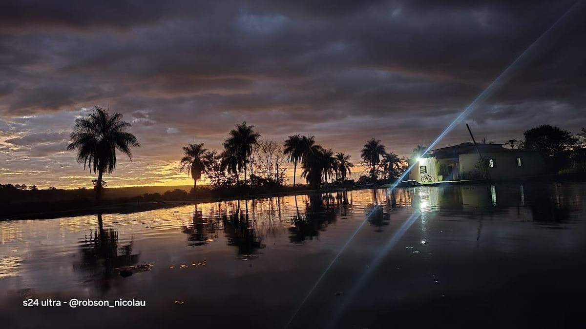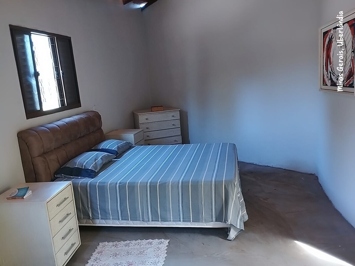 Desacelere! Um verdadeiro refúgio com tranquilidade e conforto! Localizado em zona rural a 20 min do centro de fácil acesso, segurança e wi-fi. Acomodações confortáveis sendo 1 suíte casal/ 1 suíte 3 camas solteiro/1 quarto 2 camas solteiro/ 2 WC externos, total 7 pessoas. Sala ampla c cozinha completa c vista p reserva ambiental e represa. Varanda onde cantam os pássaros. Piscina de água natural corrente, horta, córrego e acesso a represa. Este é o nosso lar que compartilhamos parte com você!