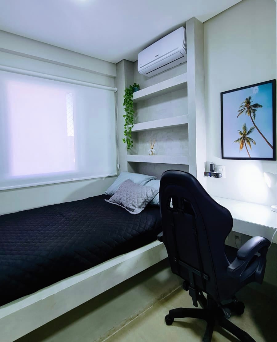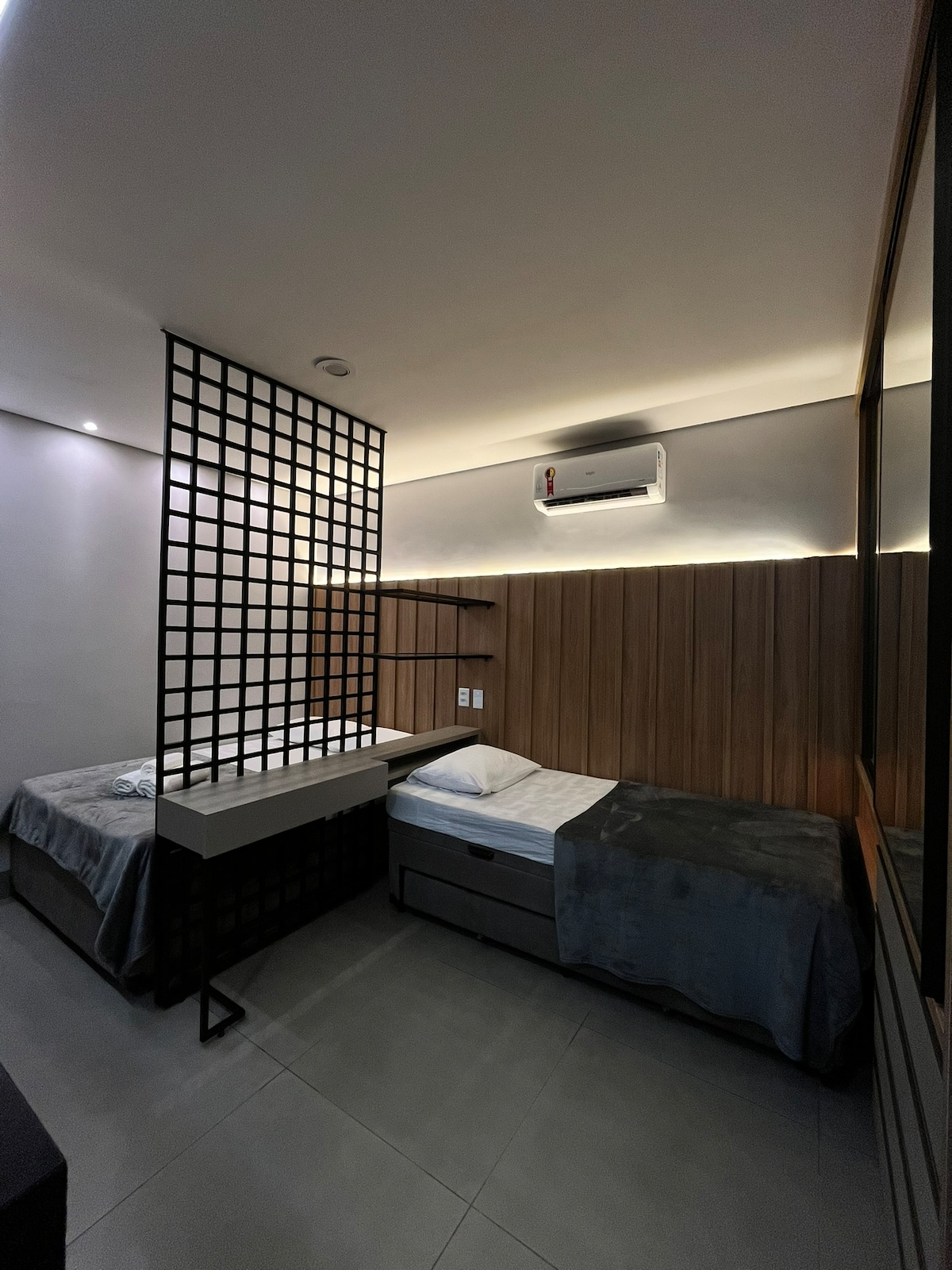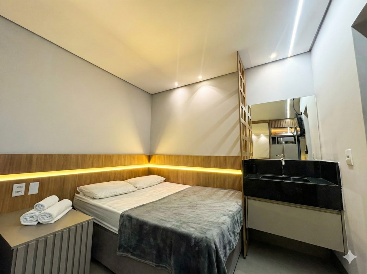 Estúdio aconchegante ao lado do Center Shopping em Uberlândia, Minas Gerais. • Localização central: 500m da Universidade de Uberlândia e Campo Santo Mônica, e a 200m da Prefeitura. • Cama box com colchão de hotelaria e roupas de cama de boa qualidade. • Cozinha com fogão elétrico e frigobar. • Banheiro compacto, mas com todas as comodidades necessárias ❌não há estacionamento disponível.