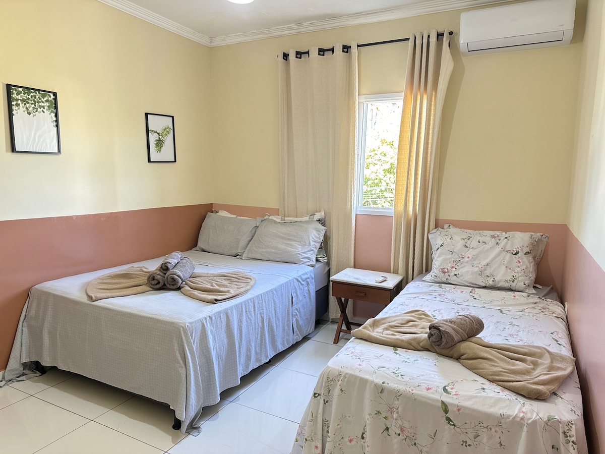 Bairro residencial, bem localizado, 15 minutos do centro. 10 minutos do Clube Cajubá e 15 do Praia Clube. Há 3 quadras uma Padaria onde encontra tudo de primeira. Perto tem um Parque Linear e tb outro Parque para caminhada e exercícios. Na residência, possui uma ampla sala com mesa q serve para jantar e ou reuniões de negócios ou familiar. 3 quartos com ar condicionado, 1 com ventilador. Cozinha equipada com filtro de água Soft, utensílios, microondas e geladeira, liquidificador.
