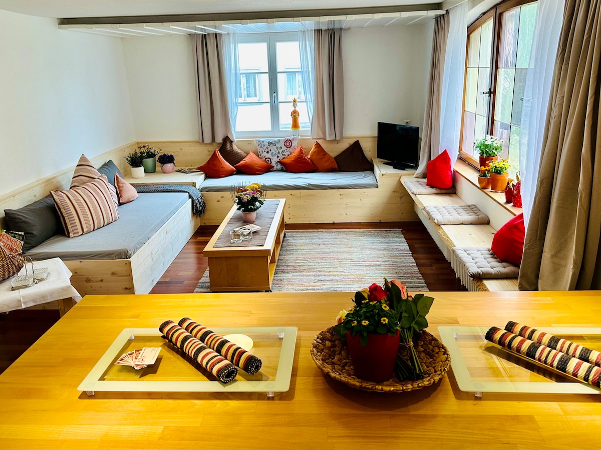 Die Ferienwohnung befindet sich im Untergeschoss unseres Wohnhauses und hat einen separaten Eingang. Sie besteht aus einem Wohn-/Schlafraum, einer Küche und einem Bad. Der Wohn-/Schlafraum ist hell und freundlich, ausgestattet mit einem Doppelbett Liegefläche 1,60 x 2,00m. Beistellbett 0,80 x 1,90m oder Kinderreisebett für 3. Person bei Bedarf. Beides gleichzeitig nicht möglich.Bad mit Dusche und WC. Die Wohnung verfügt über eine voll ausgestattete Küche. Kinderstuhl wird bei Bedarf beigestellt.