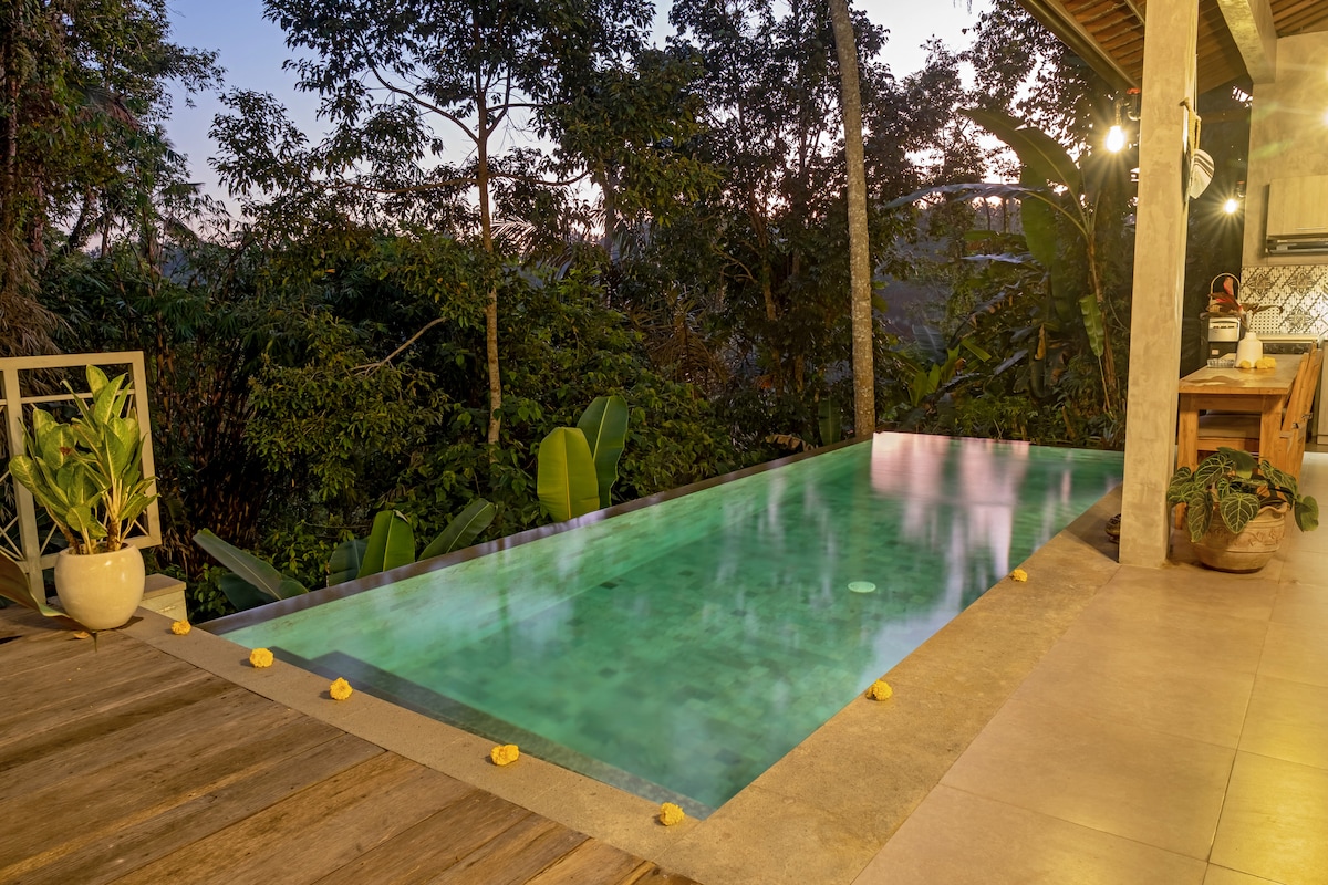 Welcome to our private villa close to downtown Ubud, where style and luxury meet in the most breathtaking way. Our 3-bedroom retreat is perched on the edge of a lush tropical gorge, with a glass-bottomed pool, a treetop yoga deck, and a hidden bar for you to enjoy your favorite libations. The villa is a mix of modern designs with chic furnishings, local artwork, and plenty of cozy nooks to snuggle up in. Come experience the hippest hideaway in town – book now and indulge in the ultimate escape!