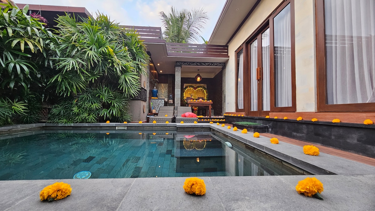 Angga Sari Villa promises a truly rejuvenating experience for travelers looking for a modern, relaxed and comfortable stay. You will feel right at home the moment you arrive here❤️ * 2 bedrooms and 2 bathrooms with toiletries * Fully equipped kitchen * Outdoor chill-out area to enjoy the warm Balinese weather * Private swimming pool with an area of 3.5x6 and a sunbed while enjoying authentic Indonesian cuisine * 100 mbps wifi and smart TV