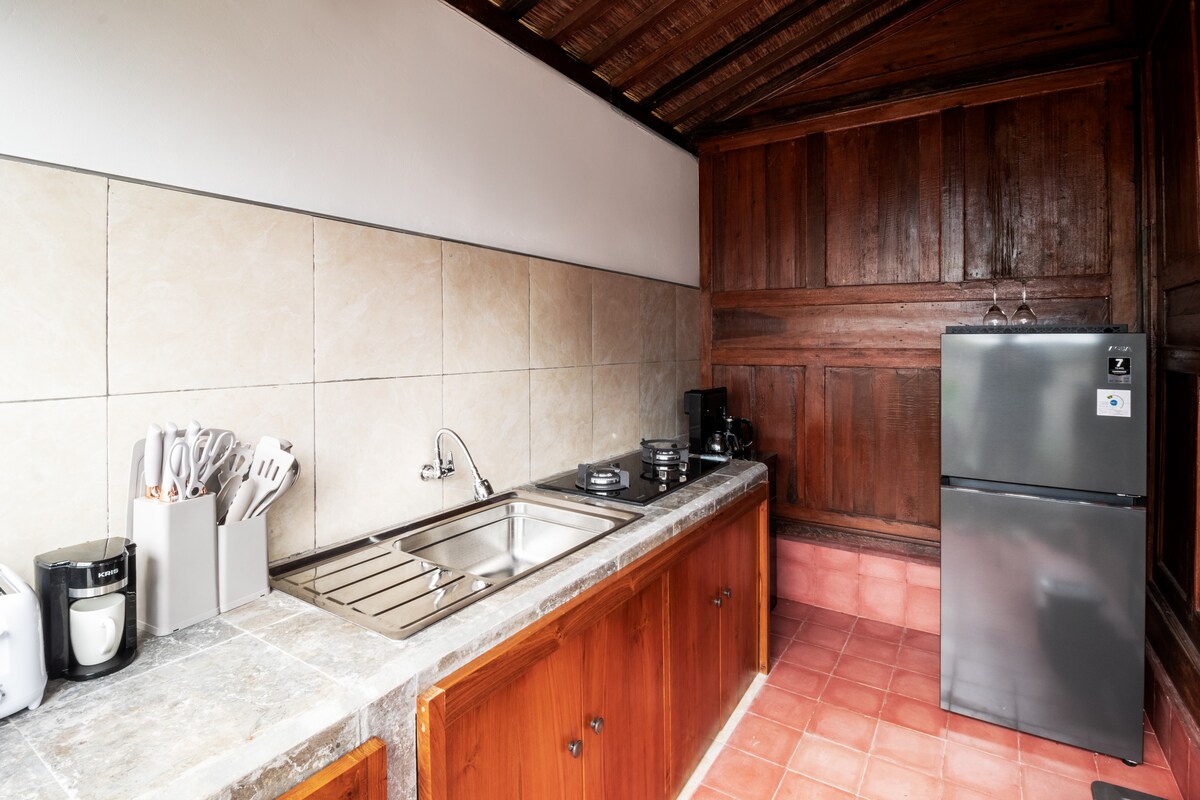 Escape to Embun Pagi Wooden Private Villa Ubud, a romantic 1-bedroom retreat in Tegalalang with stunning rice field views. Enjoy your private pool, relaxing bathtub, and a fully equipped kitchen with microwave, toaster & coffee maker. Perfect for honeymoons or peaceful getaways, surrounded by nature yet complete with fast Wi-Fi for your comfort.