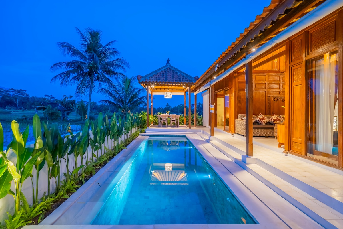 Escape to Pondok Seken Ricefield View Villa, a serene 1-bedroom sanctuary near Ubud. Immerse yourself in breathtaking views of rice fields and morning sunrises. Enjoy a cozy bedroom, well-appointed bathroom, private pool, kitchen, outdoor bathtub, and living area. Relax in the garden oasis. Explore Ubud's vibrant center and indulge in nearby vegan restaurants. Find tranquility and natural beauty in this idyllic retreat.