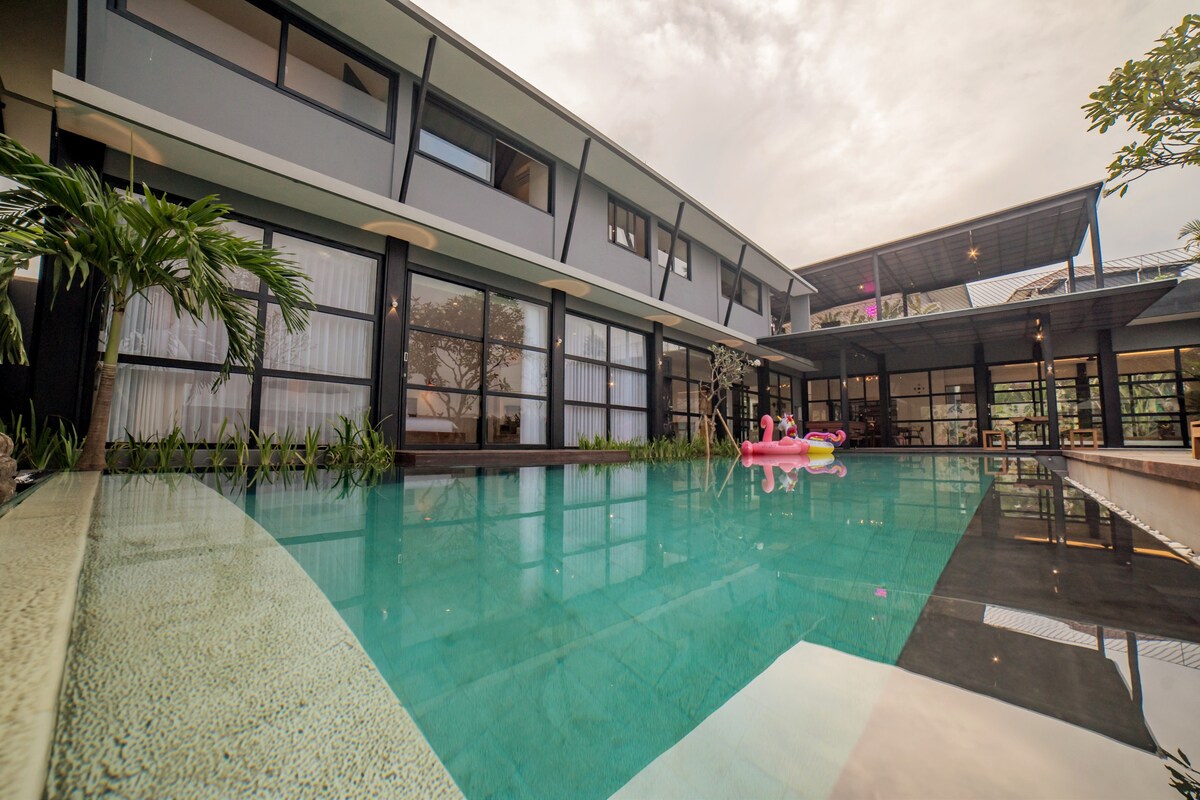 FINNS BEACH CLUB - 5 minutes. Very large 800 sqm 4 bedrooms luxury villa in Canggu. • Private villa - full privacy guaranteed • Big Pool (12x4m) • Sauna • Rooftop bar with rice field view • Billiard table • Big Parking space - up to 5 cars • AC in living room and AC and Smart TV in every room • Fully equipped enormous kitchen • WIFI - Super Fast 150Mb/s • Netflix on TV Escape to this captivating large and luxurious villa in Bali, with its stunning beaches and breathtaking views