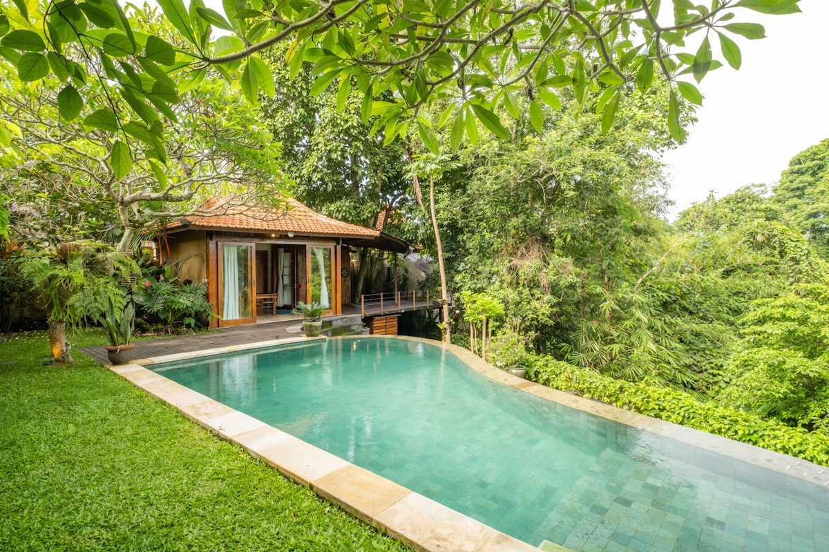 Hidden Ubud Gem! Enjoy our brand-new Infinity Pool (measures 10 m x 4 m), which is shared by three cabins on our expansive property, including our cooking school. Our original Tresna Bali Cabin - a unique local treasure which we reassembled piece by piece in our garden and added a luxurious bathroom. You’ll experience village life waking up to roosters under intricate Balinese wooden rafters. If you prefer more privacy and spectacular views, book our Riverview or River Valley View cabin.