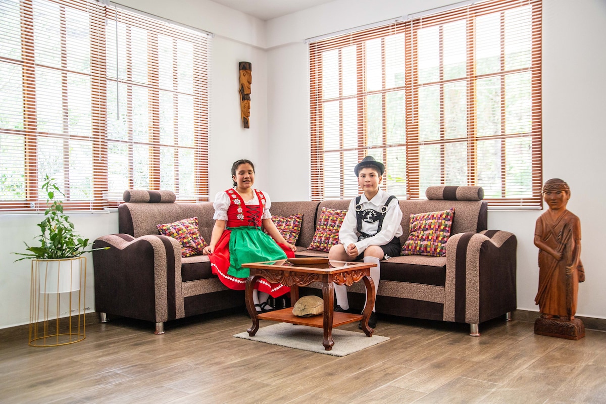 Disfruta de una experiencia con estilo en este alojamiento céntrico y a la vez en el bosque conectando con la paz de la naturaleza y a minutos de la plaza central. Vas ahorrar tiempo y combustible. • Baño con agua caliente • 2 habitaciones con 3 camas • 2 camas de 2 plazas y 1 cama de plaza y media • Terraza con vista al bosque y parrilla • wifi • Sala comedor • cocina equipada • 2 televisores también vas apreciar la variar de aves, ardillas y monitos que nos visitan de la naturaleza.