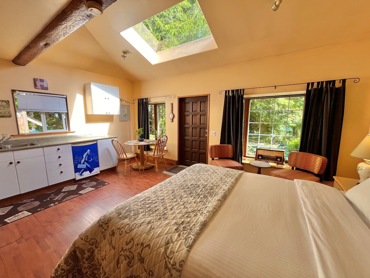 The LONGBEACH Loft is located at The Outside Inn. 5 acre property that is located in a quiet forest setting with tons of nature and space. The Loft is downstairs living with bedroom and bathroom up. It’s best suited for couples or small families with a pull out sofa bed downstairs. 2 chairs and a dining table. This unit has a kitchenette . Please request to bring a dog prior to booking. Endlessride Surf School offers daily lessons.