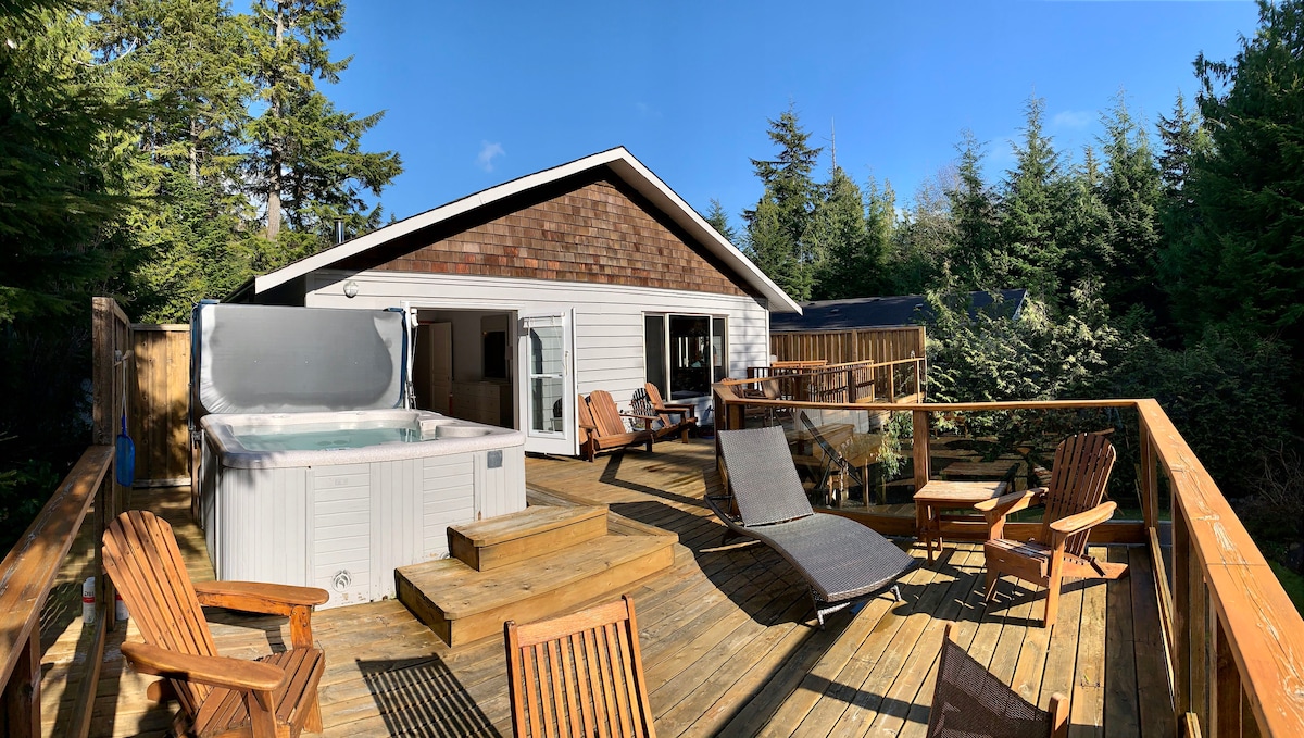 Unwind in your private hot tub, cold plunge, & patio with a campfire — ideal for storm watching, hearing the waves, and spotting wildlife like eagles, deer, & bears in the lush West Coast rainforest outside your door. This spacious, quiet, & cozy suite in a new home is pet-friendly & fully equipped — with peek-a-boo ocean views. A 10-minute walk takes you to the Wild Pacific Trail, town center, beaches, restaurants, surf shops, & the harbour (w/ sea lions!). Surf beaches are a 12–15 min drive.