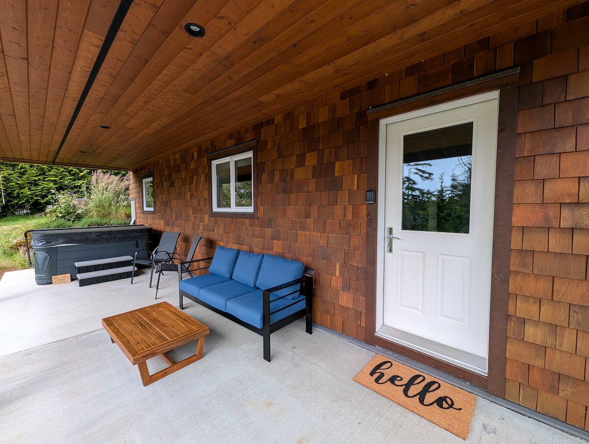 Unwind in your private hot tub, cold plunge, & patio with a campfire — ideal for storm watching, hearing the waves, and spotting wildlife like eagles, deer, & bears in the lush West Coast rainforest outside your door. This spacious, quiet, & cozy suite in a new home is pet-friendly & fully equipped — with peek-a-boo ocean views. A 10-minute walk takes you to the Wild Pacific Trail, town center, beaches, restaurants, surf shops, & the harbour (w/ sea lions!). Surf beaches are a 12–15 min drive.