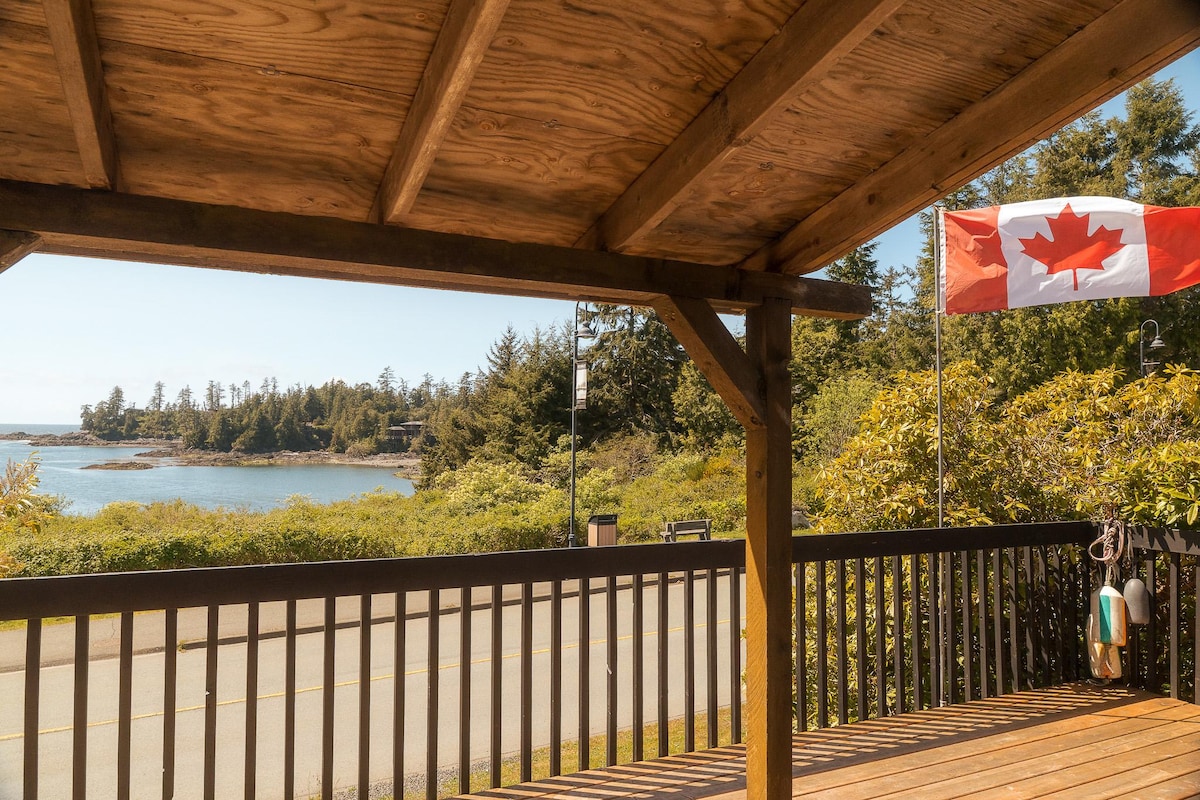 Cozy cedar cottage-style rooms with open-concept living space. Fully equipped kitchen includes coffee maker, toaster, kettle, stove, cookware, and dishware. Deck with ocean views. Perfect for couples wanting extra space to unwind after coastal adventures.