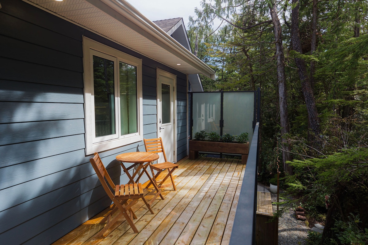 Favorite for couples and small families. Private, ground level suite is perfect for 1 or 2 adults but can sleep 3. Small kitchen, bathroom, single bed/couch & adjoining bedroom with queen bed. BBQ, deck, hot tub & wood fired dry/steam sauna & outdoor shower. 12.5 kw/h EV Charger. Dog friendly for 2 small dogs/1 medium dog *pls inform when booking. Surf & hike the beaches & Wild Pacific Trail minutes from your door. DOU Licence#00006794, BC STRR Regn #H348680415 Max Occup. 4.