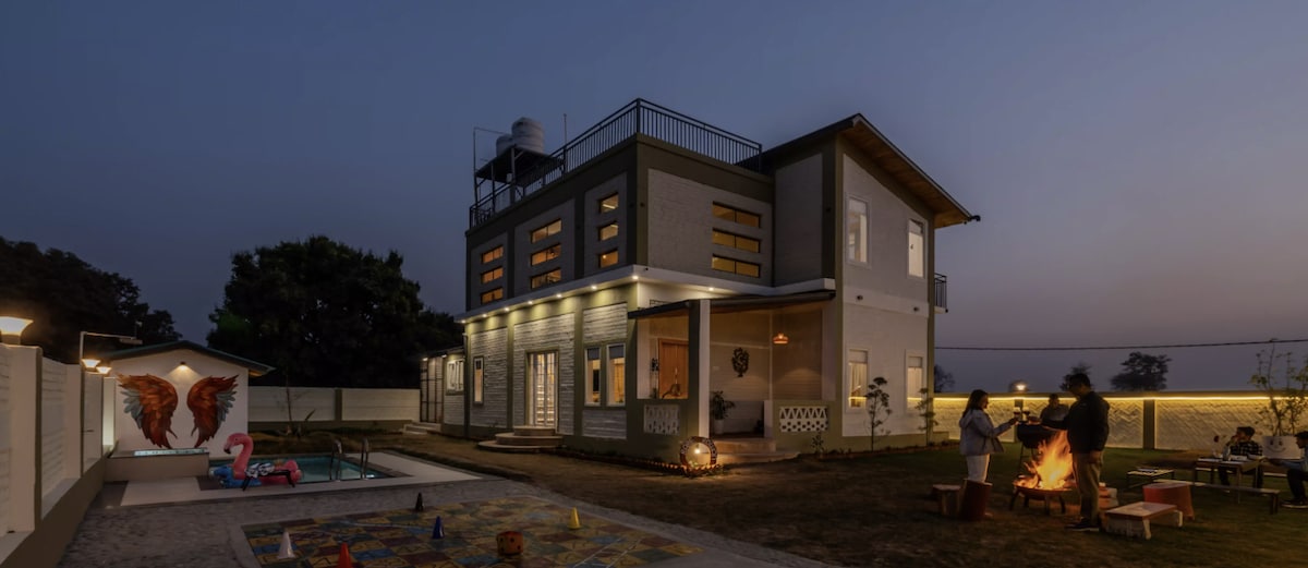 A serene 2-bedroom farmstay in the Terai countryside, set beside a tranquil pond surrounded by open fields, orchards and everything nice that nature has to offer. Just 4.5 hours from Delhi and about 40 mins before Haldwani, this family-run home with a private pool that blends earthy design, warm hospitality, farm-fresh meals, and quiet moments by the water — a peaceful escape into Uttarakhand’s tranquil farmlands especially if you are planning an uphill trip to Kumaon.