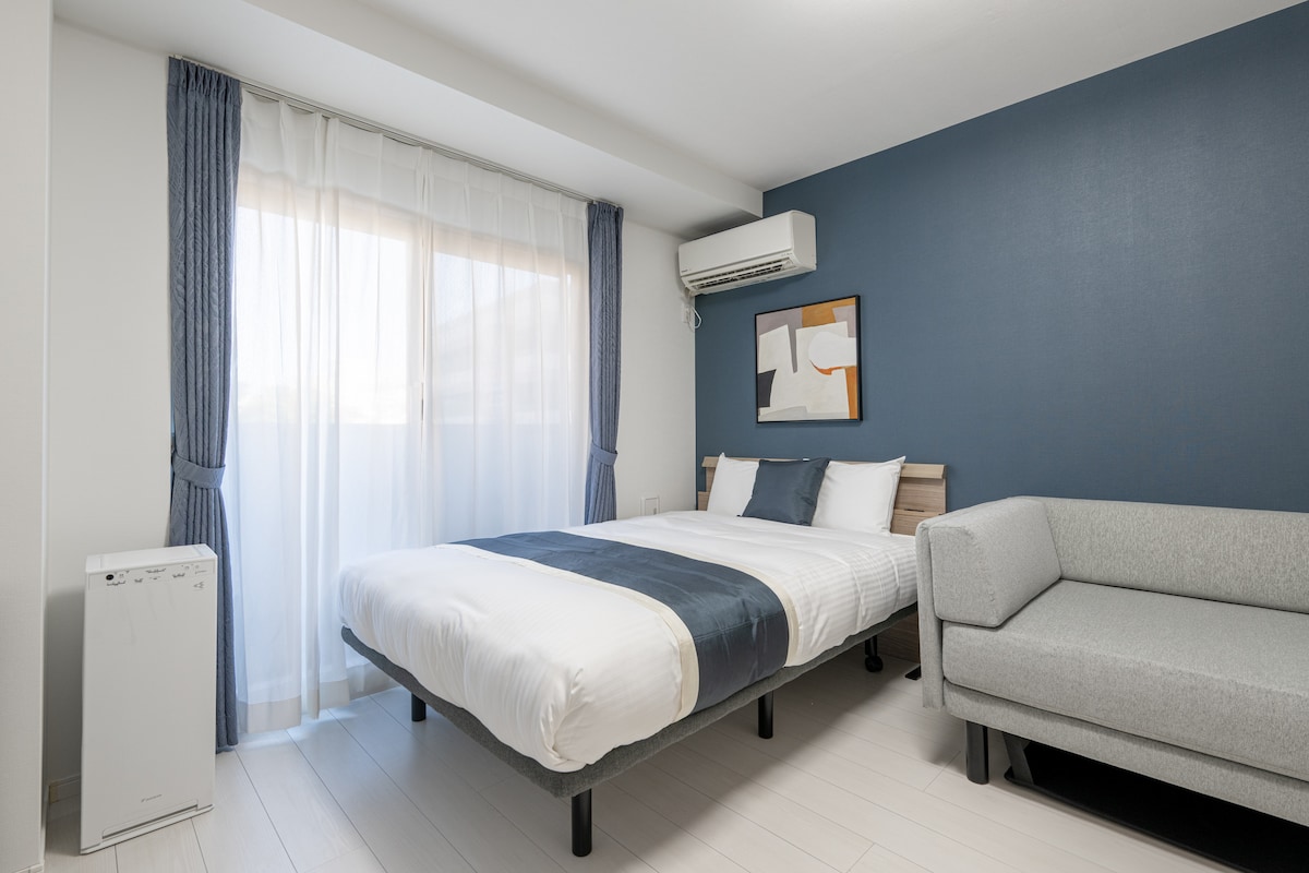 Newly built with travelers in mind. The rooms are spacious with Queen size beds (practically unheard-of in Japan). Smart TV, Wi-Fi, tea and coffee. The bathrooms are fashionable, with large walk in rain showers. LED mirrors to get you ready for whatever lighting you will encounter. Rooms have a bar fridge, microwave and kettle for you to store and prepare ready-made meals and drinks. All rooms come equipped with Air-conditioning, ceiling fans and black-out curtains. Ample storage space also!