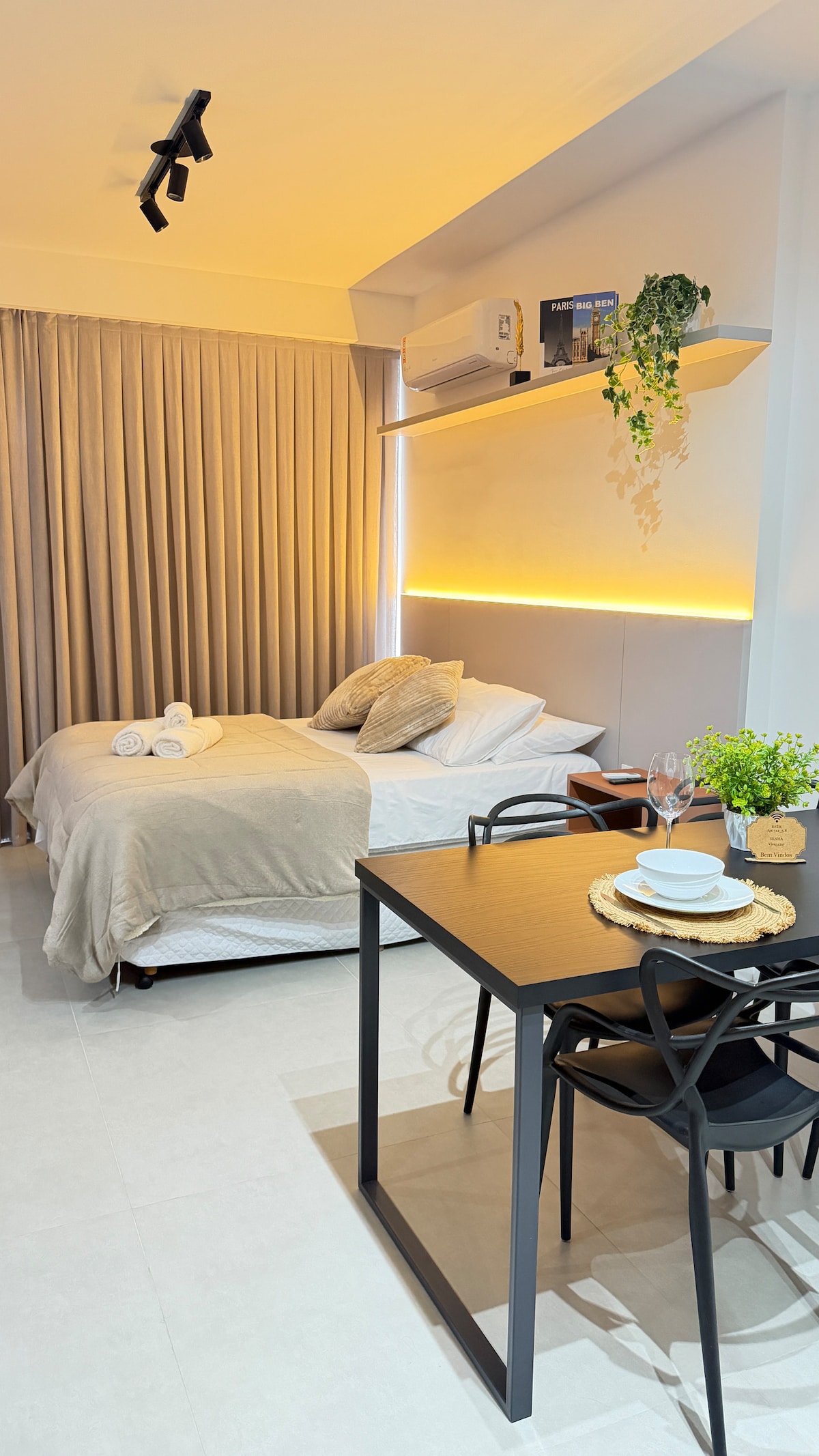 Complete studio with panoramic view! With a privileged location in Trindade, this studio offers a stunning city view. Equipped with a queen bed, air conditioning, Smart TV, Wi-Fi, and a fully equipped kitchen. Enjoy the common areas, such as the gym and Zen space. Just a few minutes from the beaches and with easy access to the best spots in the city. Don't miss the opportunity to book your stay in one of the best places in Florianópolis!