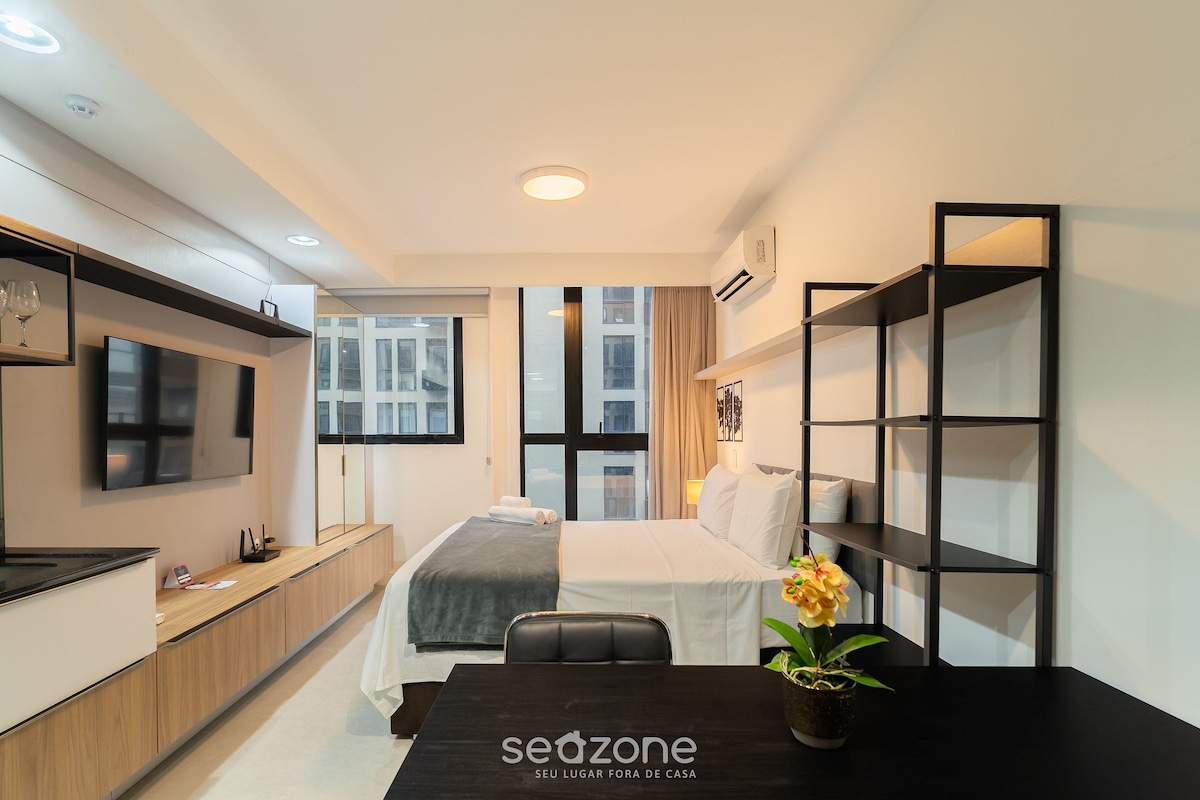 Looking for a cozy checkpoint in the heart of the city? You'll feel at home in this well-planned loft. Located in downtown Florianopolis, it's perfect for someone looking to explore the island or attend to an event nearby. Includes: - Queen bed - Complete gourmet kitchen - Washer and drier - Big table for meals and Home Office - 360 Rotational TV so you can watch from anywhere in the loft - Clean and modern bathroom - Wi-fi - Complete air conditioning