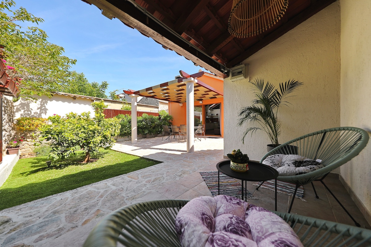 • Located about a 10 minute drive from the Zadar Old Town, is this villa situated on a quiet street 5 minutes from one of the finest beaches in the Zadar area. • Enter an open concept living area, with floor to ceiling sliding doors that give you a excellent view of the backyard. The yard has two sitting areas, a brick grill, with a great sense of privacy. Indoors, a sunlit space features high ceilings with exposed beams in the living area, which also have skylights offering a bright retreat.